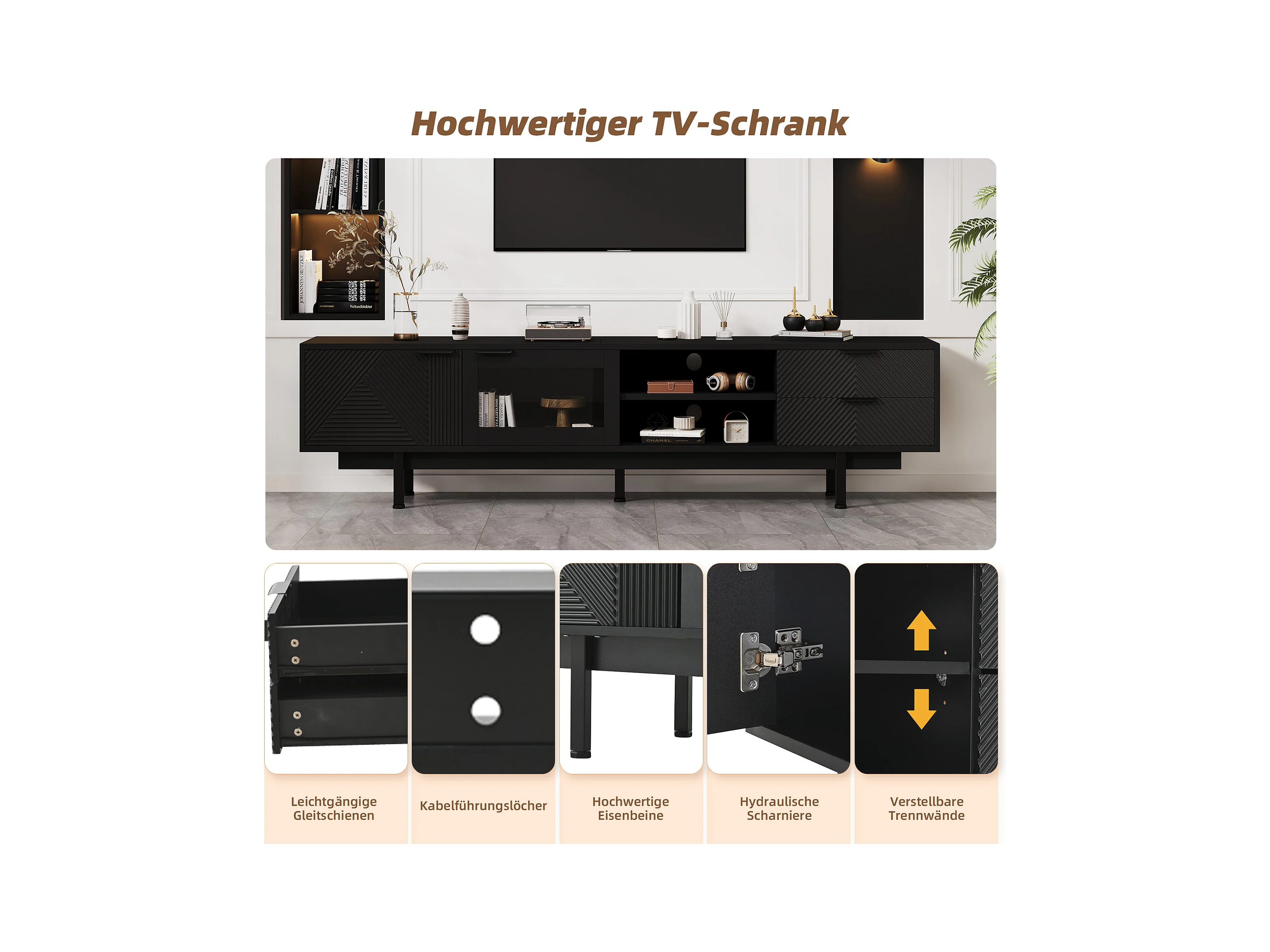 Meuble TV moderne - 180 x 38 x 50 cm - avec 2 portes à motif de vagues d'eau + 3 tiroirs - MDF - noir