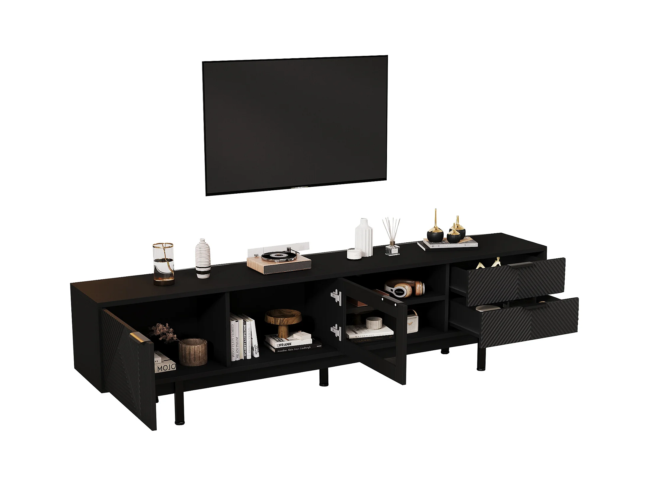 Meuble TV avec pieds en bois - 180 x 40 x 42 cm - avec 2 tiroirs + 4 portes - aggloméré - noir