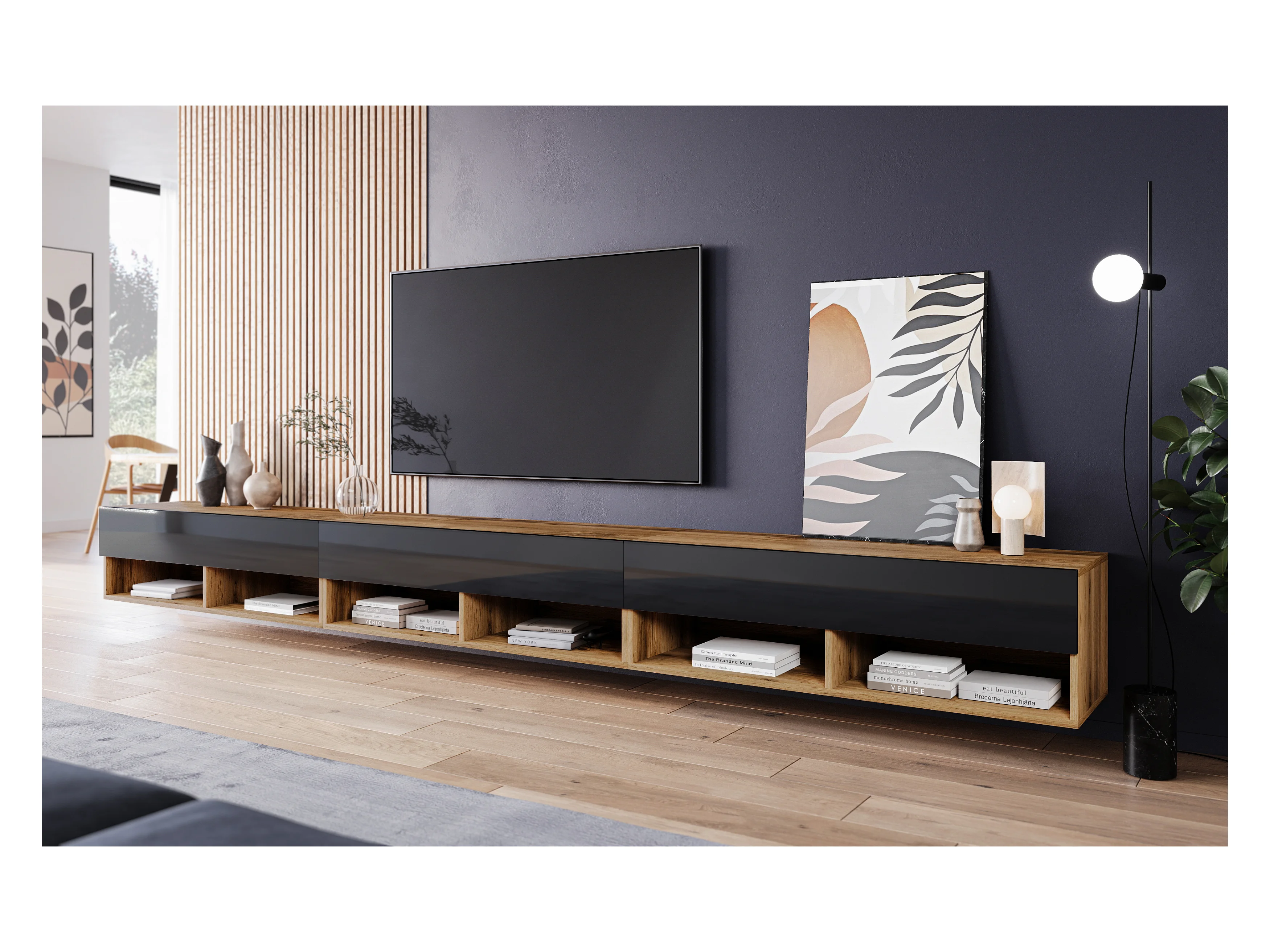 Meuble TV moderne 300 cm avec LED – sans poignées, corps chêne wotan, façades noir brillant Polygloss, posé au sol ou suspendu