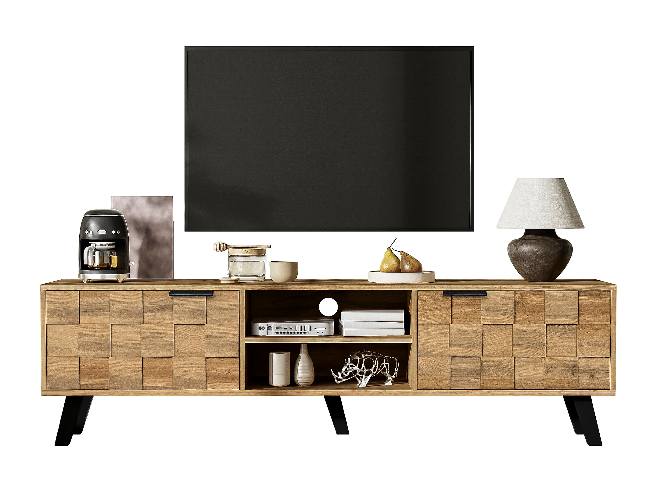 Meuble TV moderne avec 2 portes et 2 espaces ouverts, design en bois, 160.5x35.5x45cm