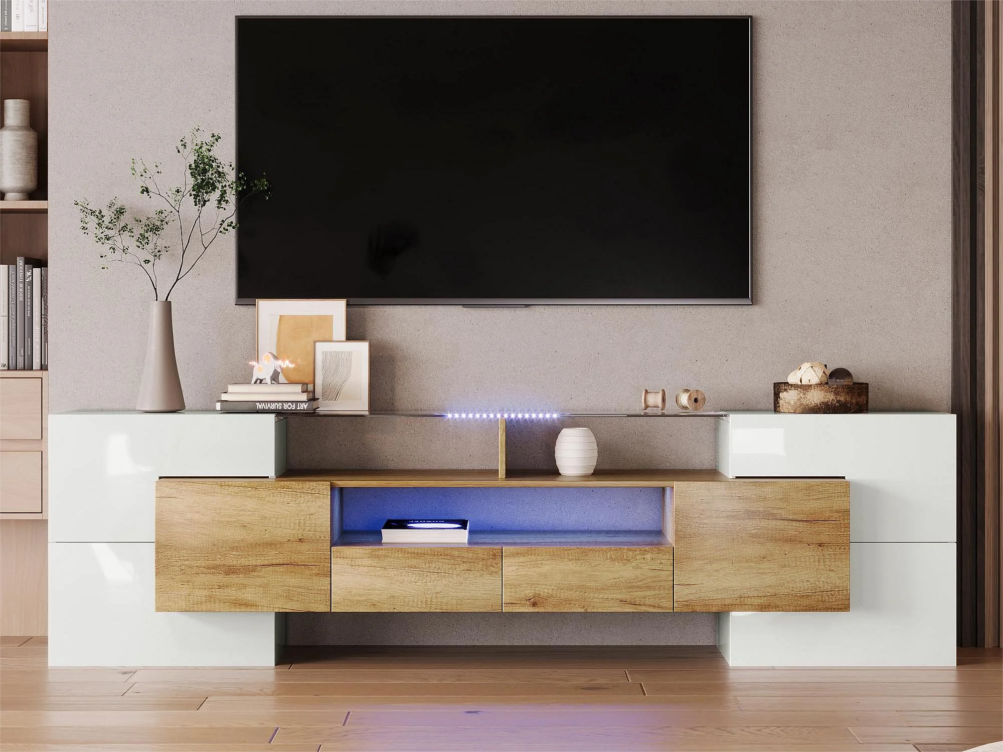 Meuble TV moderne avec 4 portes 2 tiroirs & 2 niches - Aspect blanc brillant - LEDs - Longueur 200cm - Coloris chêne