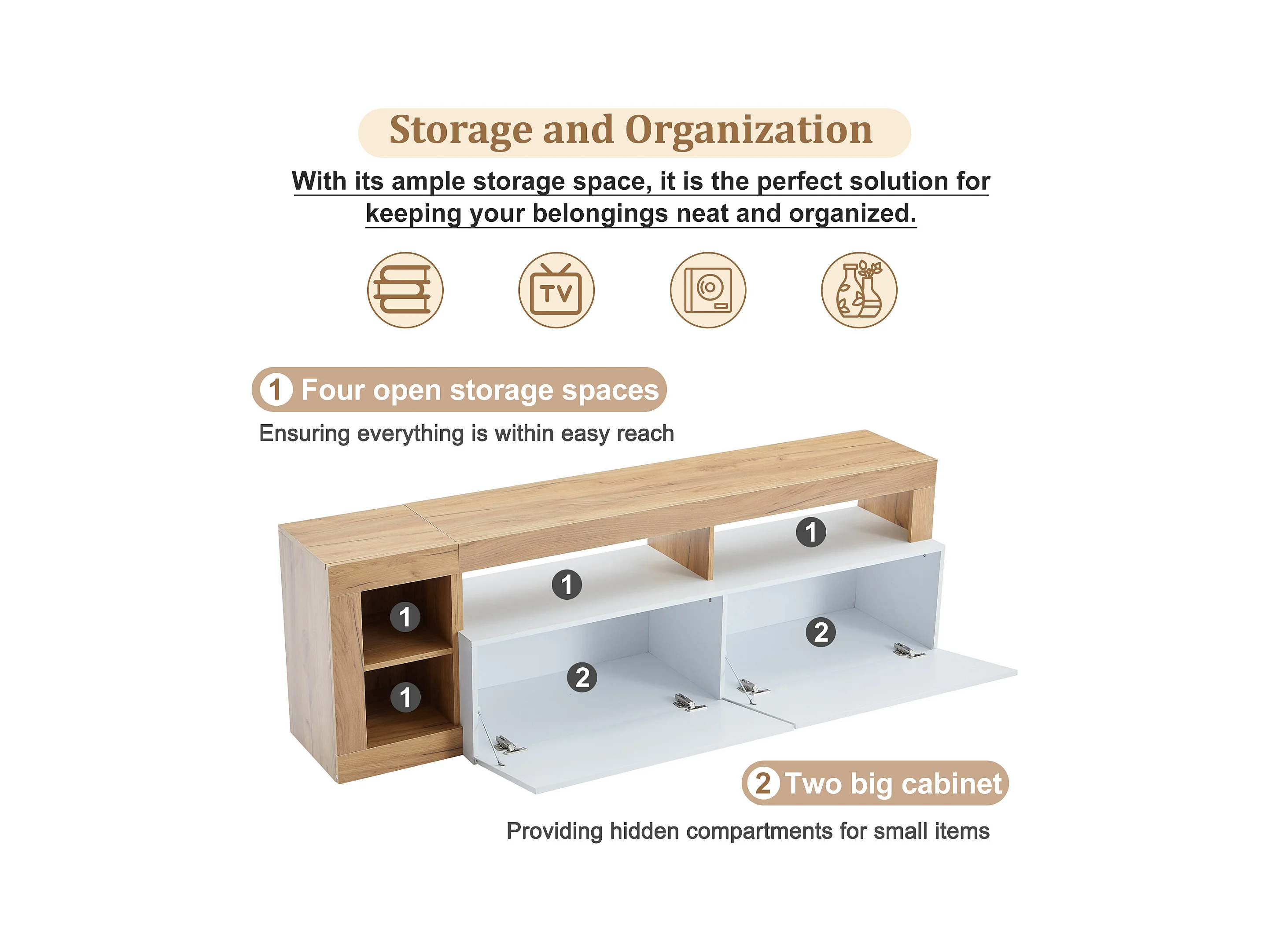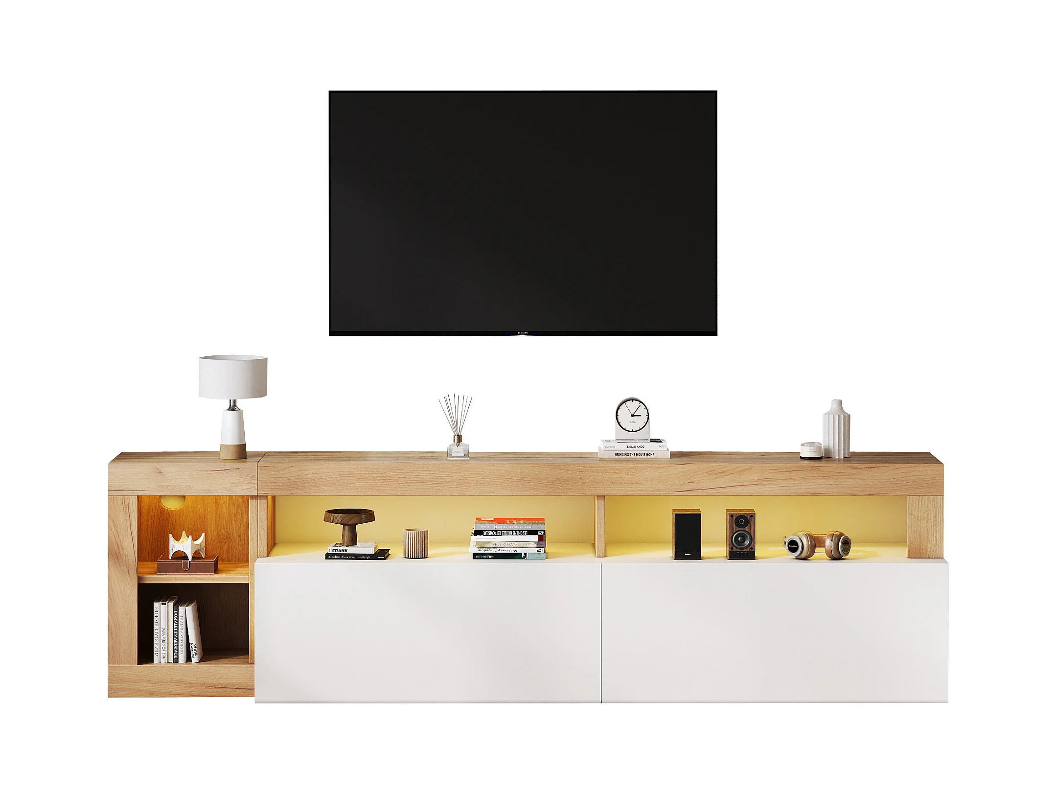 Meuble TV moderne avec éclairage LED, pour téléviseurs jusqu'à 80 pouces, bois naturel et portes blanches (184x42x58 cm)