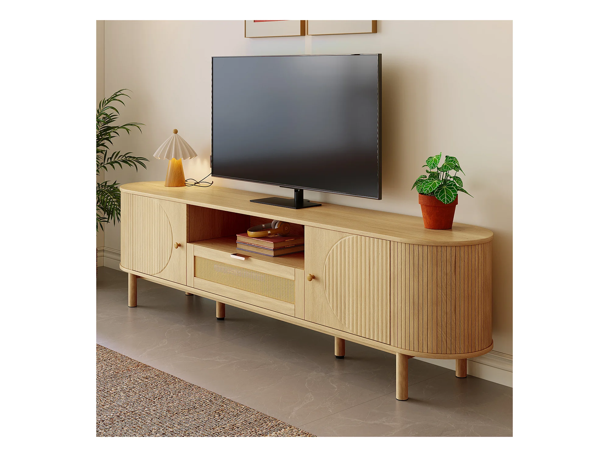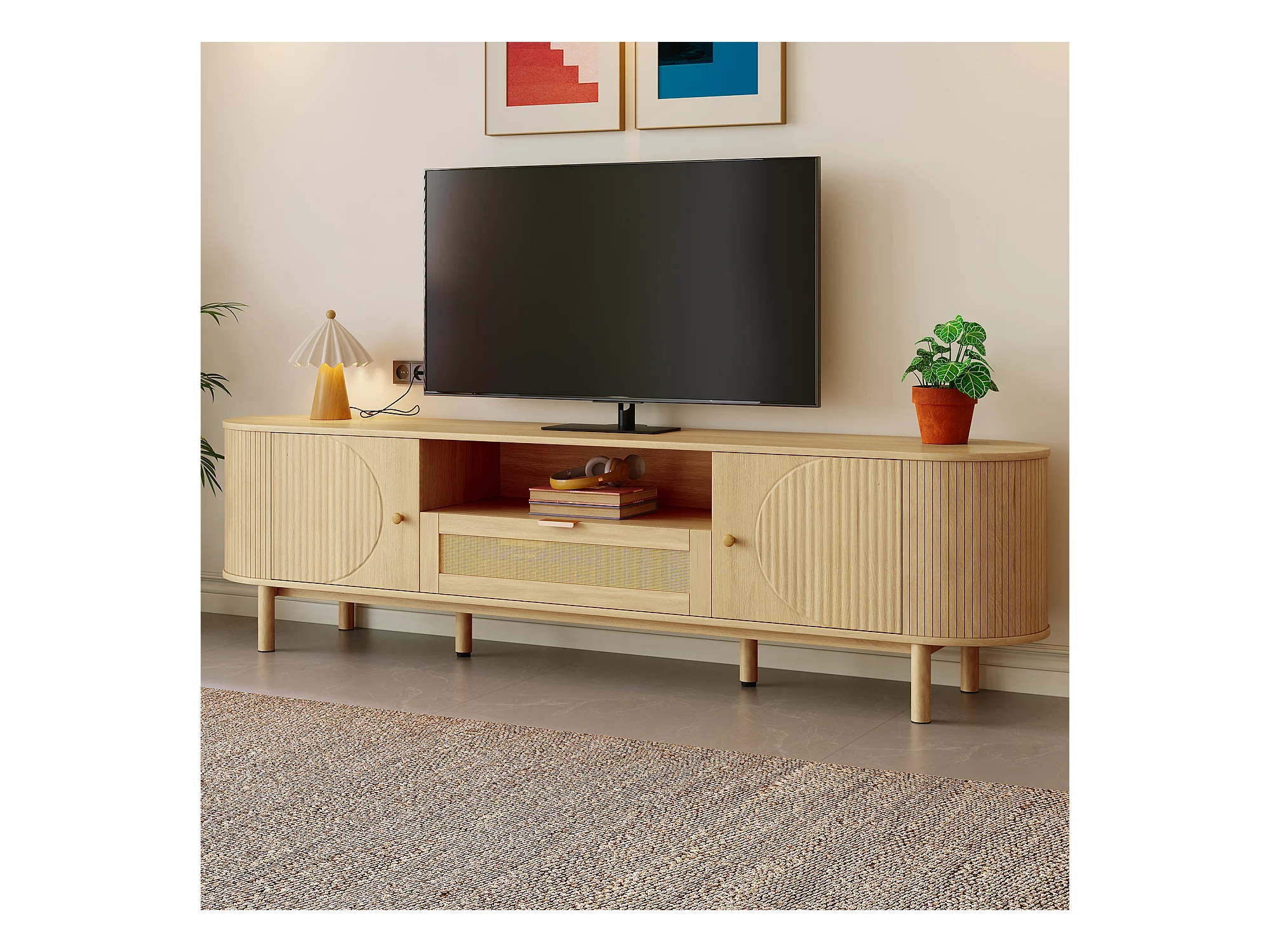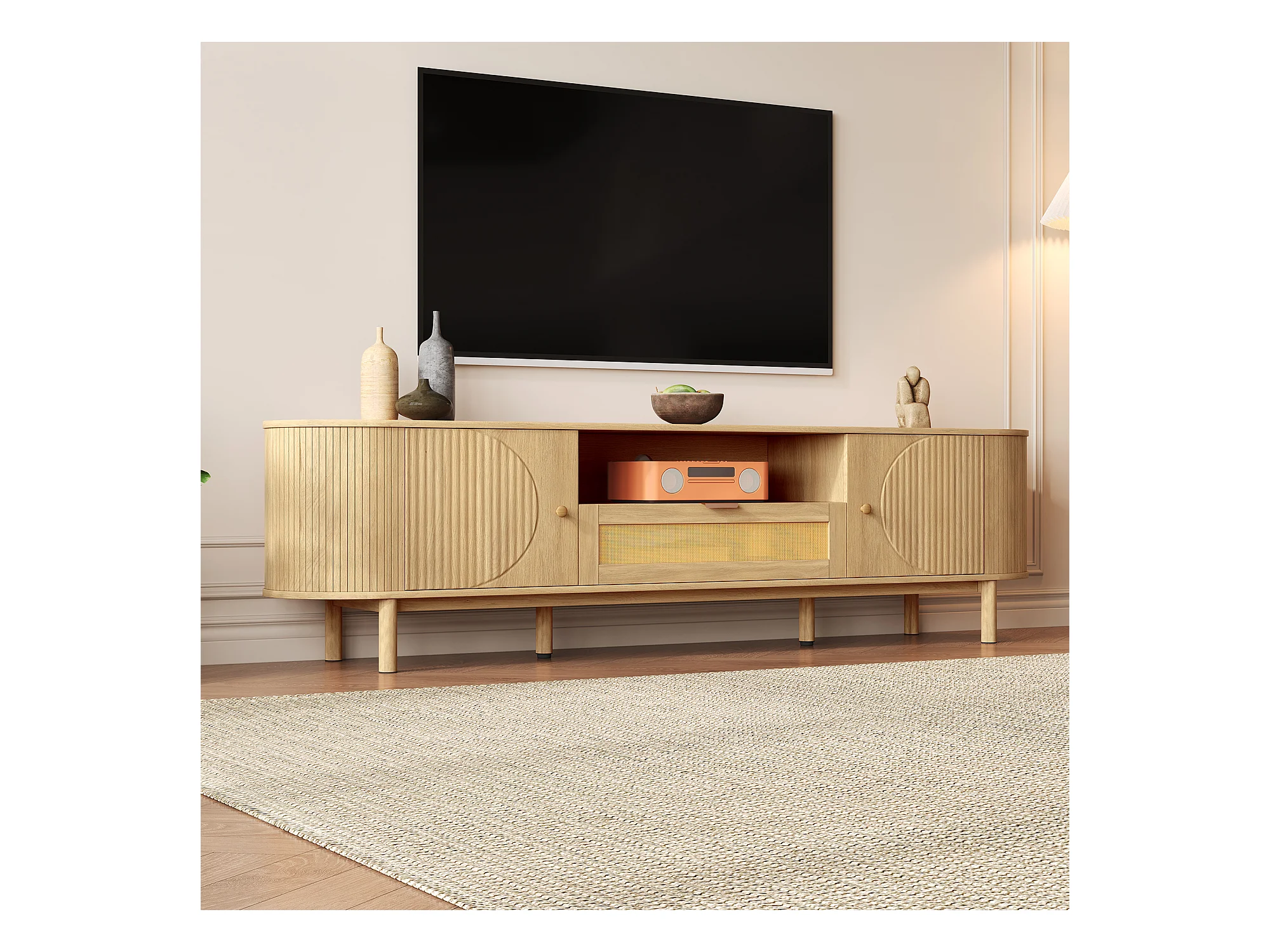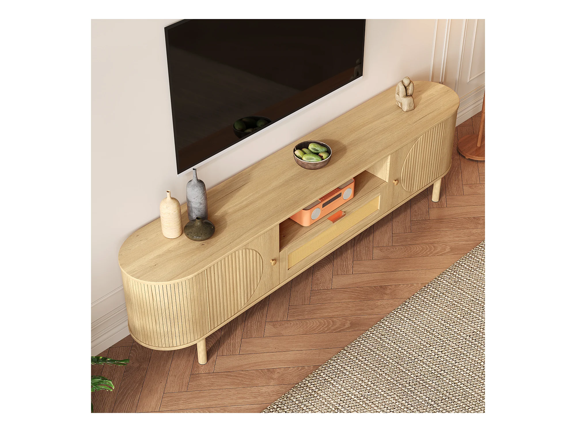 Meuble TV moderne avec tiroirs en rotin, plateau arrondi et pieds métalliques imitation bois, MDF, couleur naturelle (175x36x51cm)