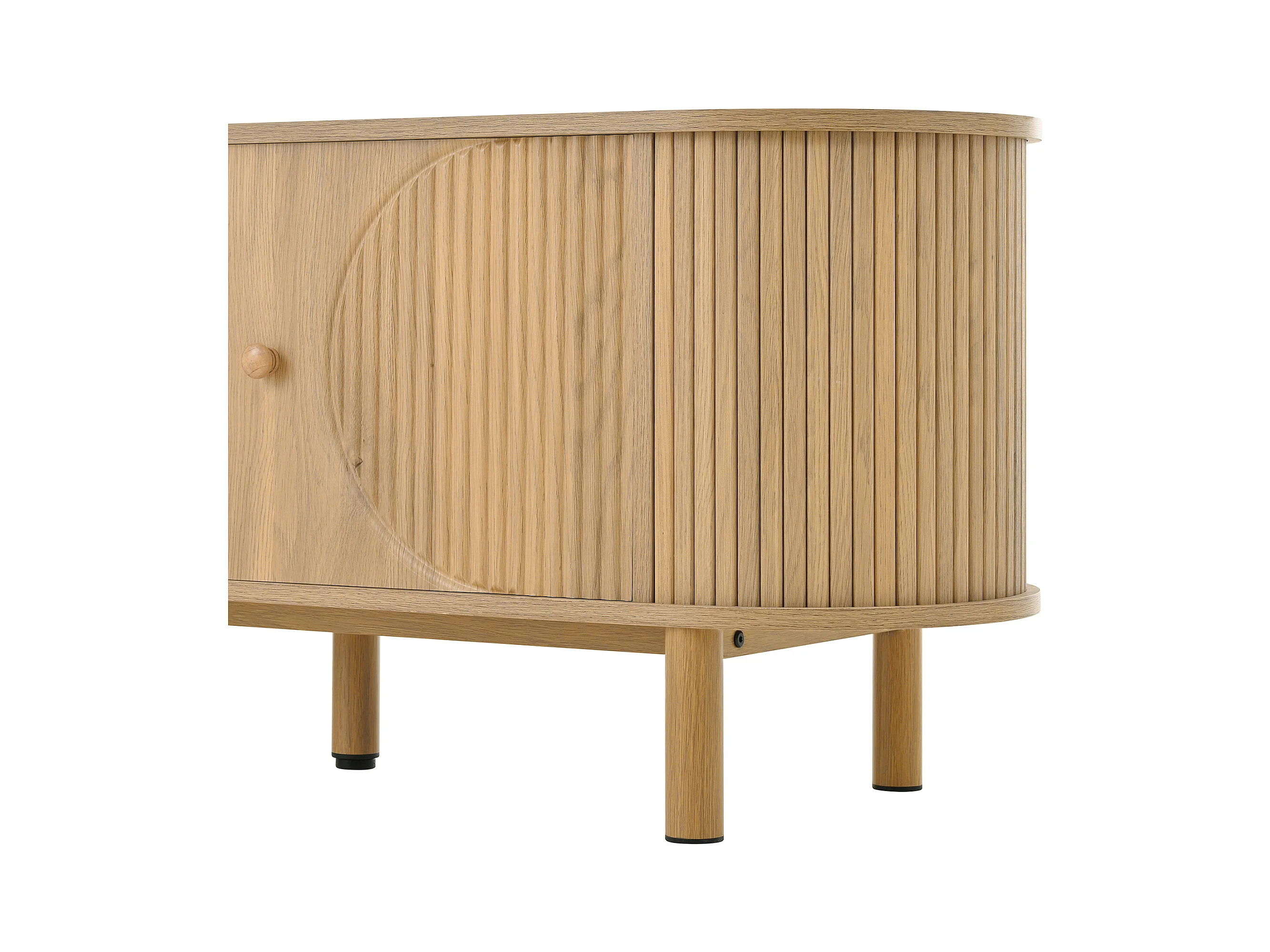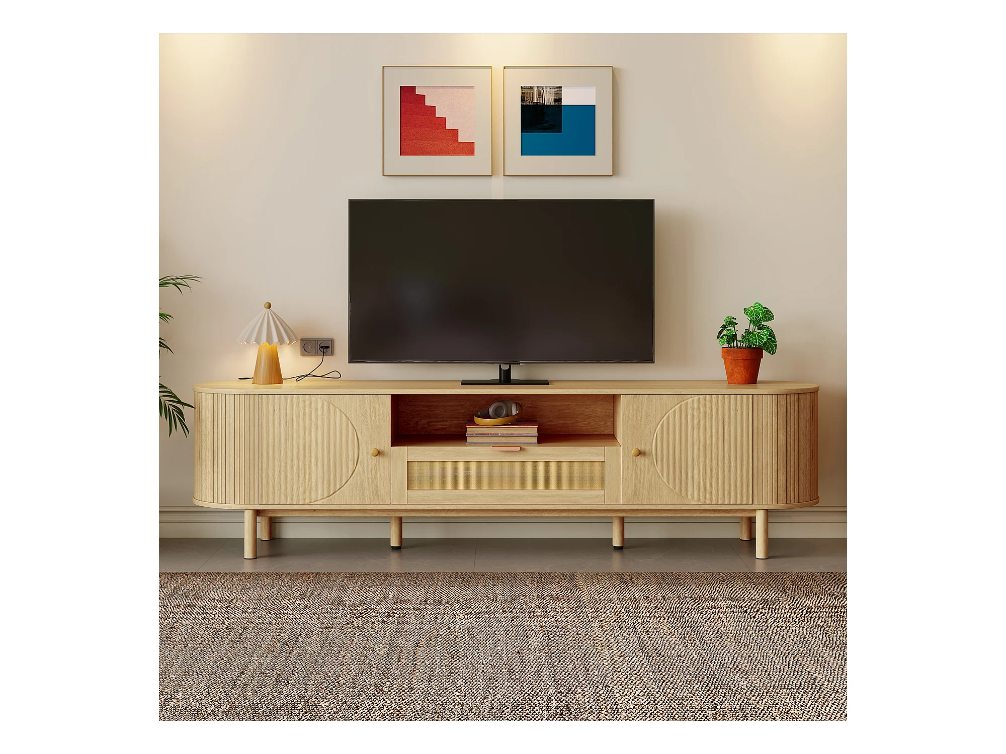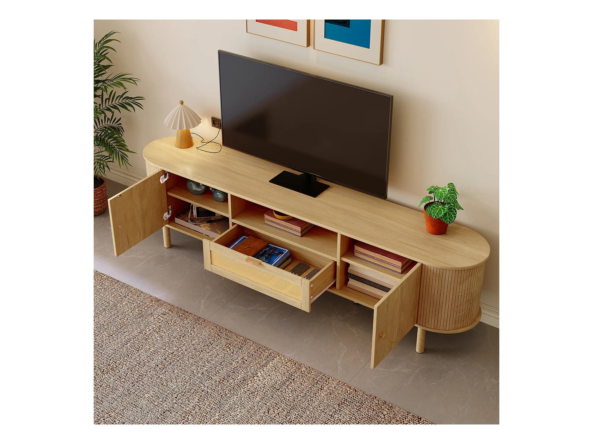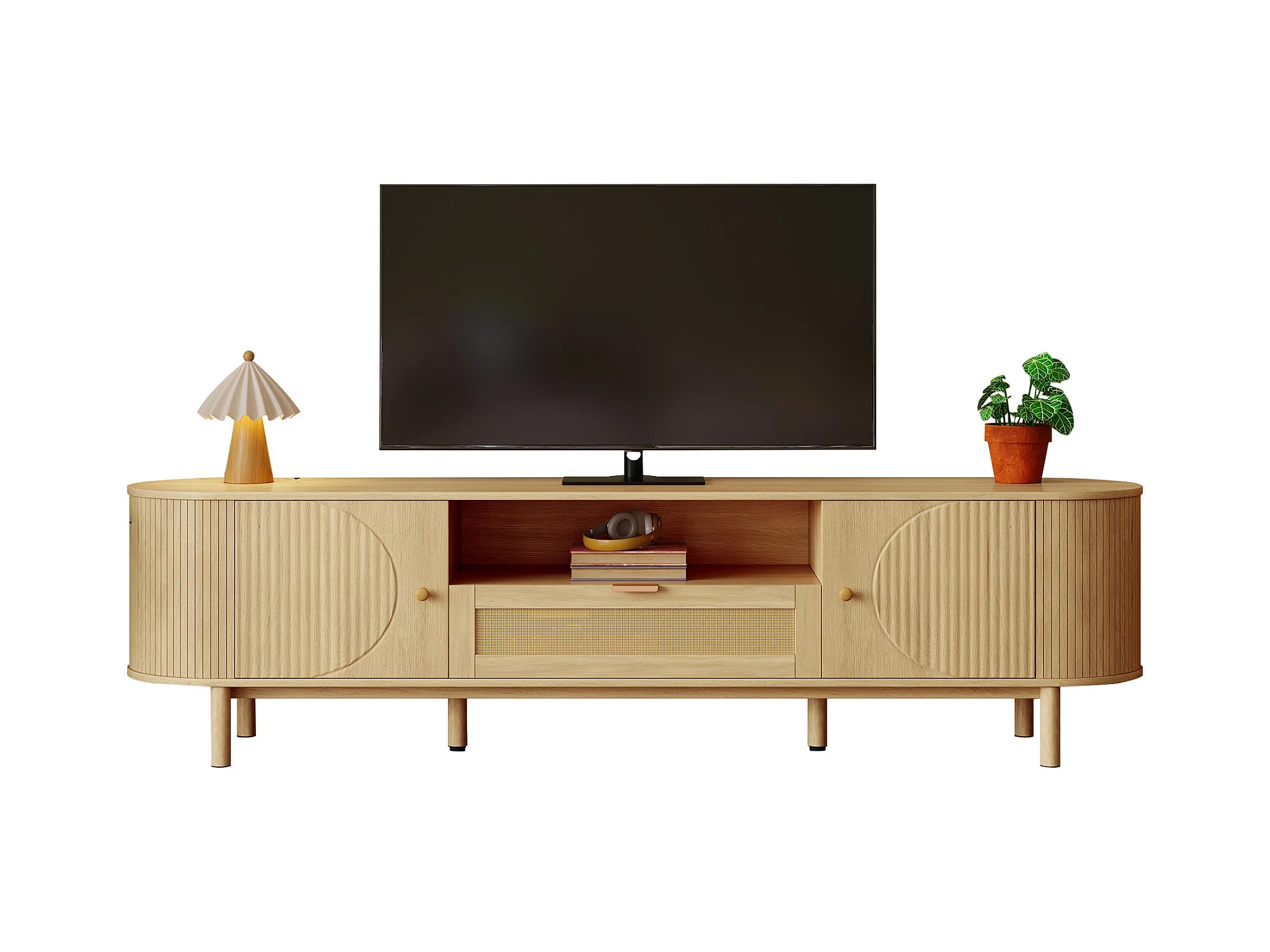 Meuble TV moderne avec tiroirs en rotin, plateau arrondi et pieds métalliques imitation bois, MDF, couleur naturelle (175x36x51cm)