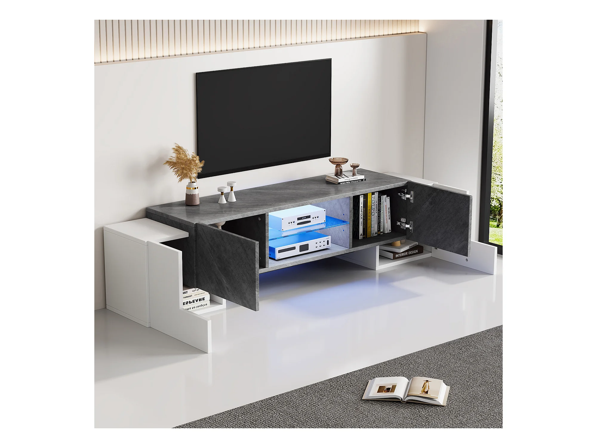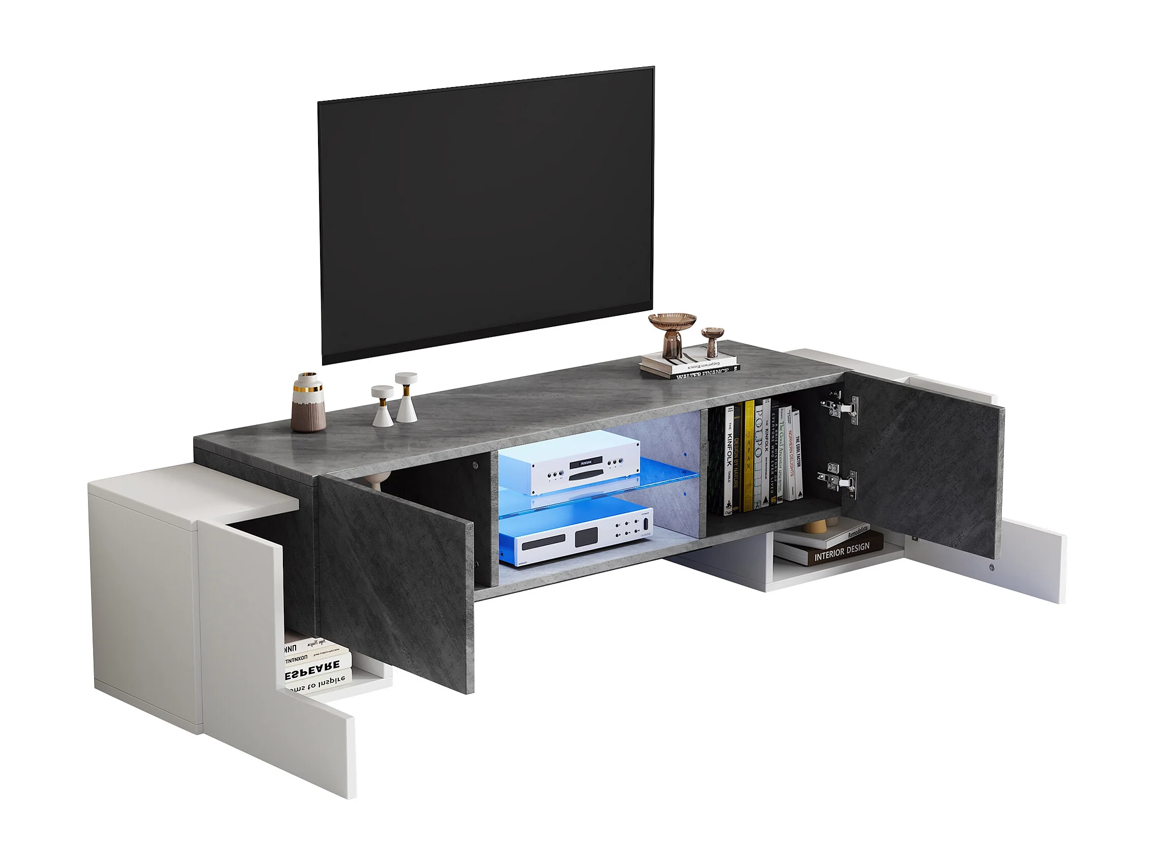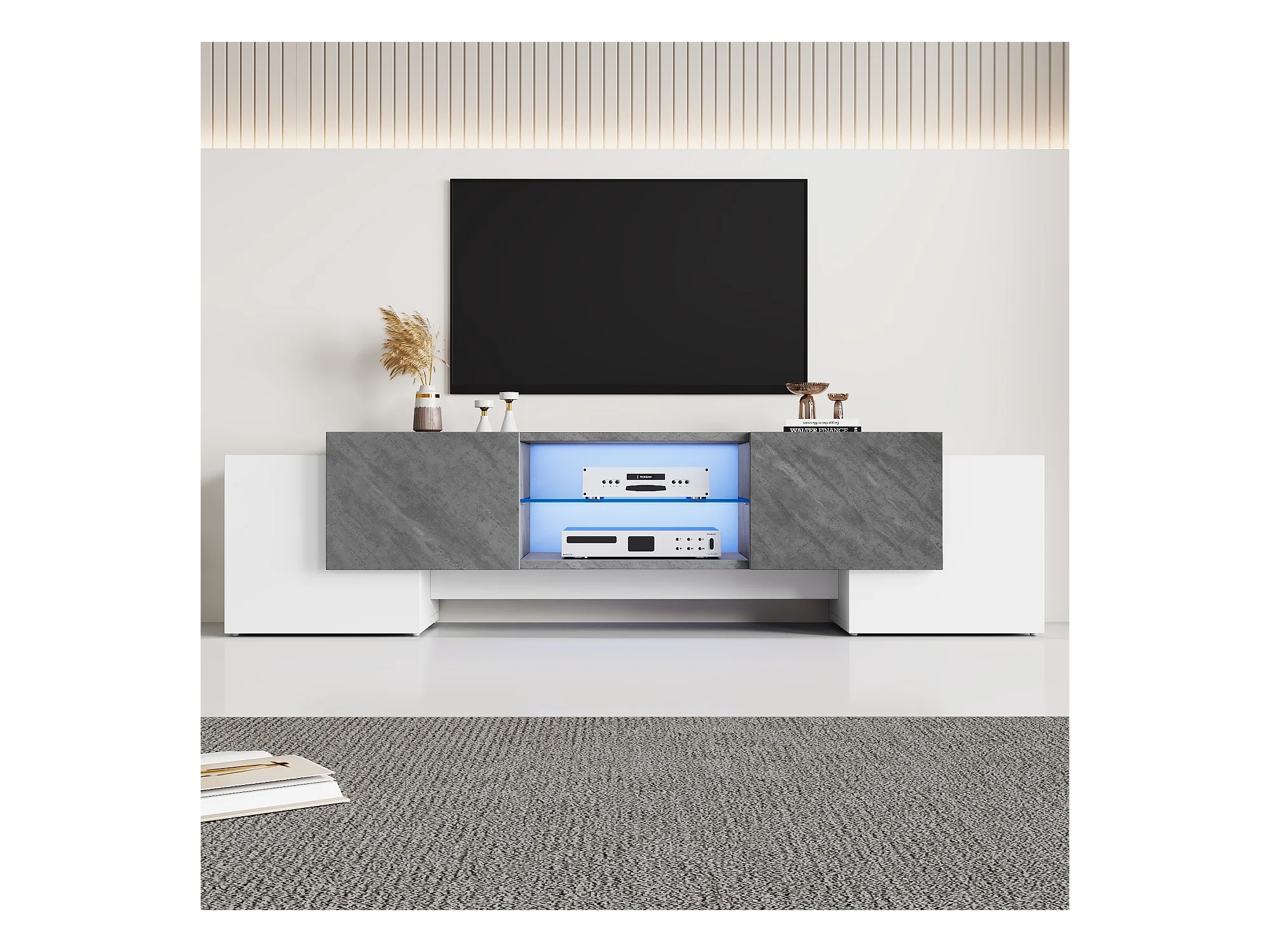 Meuble TV Moderne Blanc et Gris, 4 Compartiments, Verre et MDF (180x40x46.5cm)