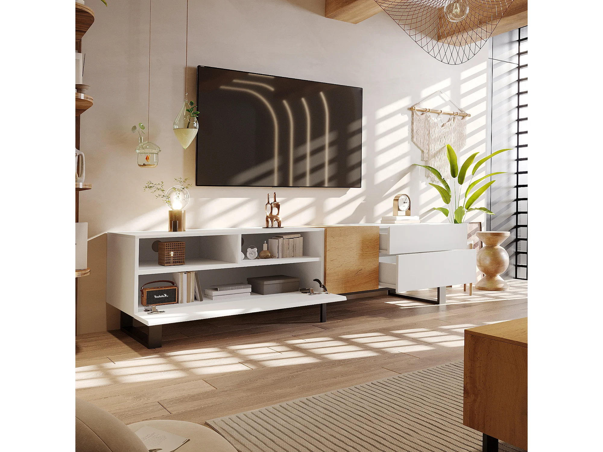 Meuble TV moderne, design bois et blanc, avec rangement, 180x38x50cm