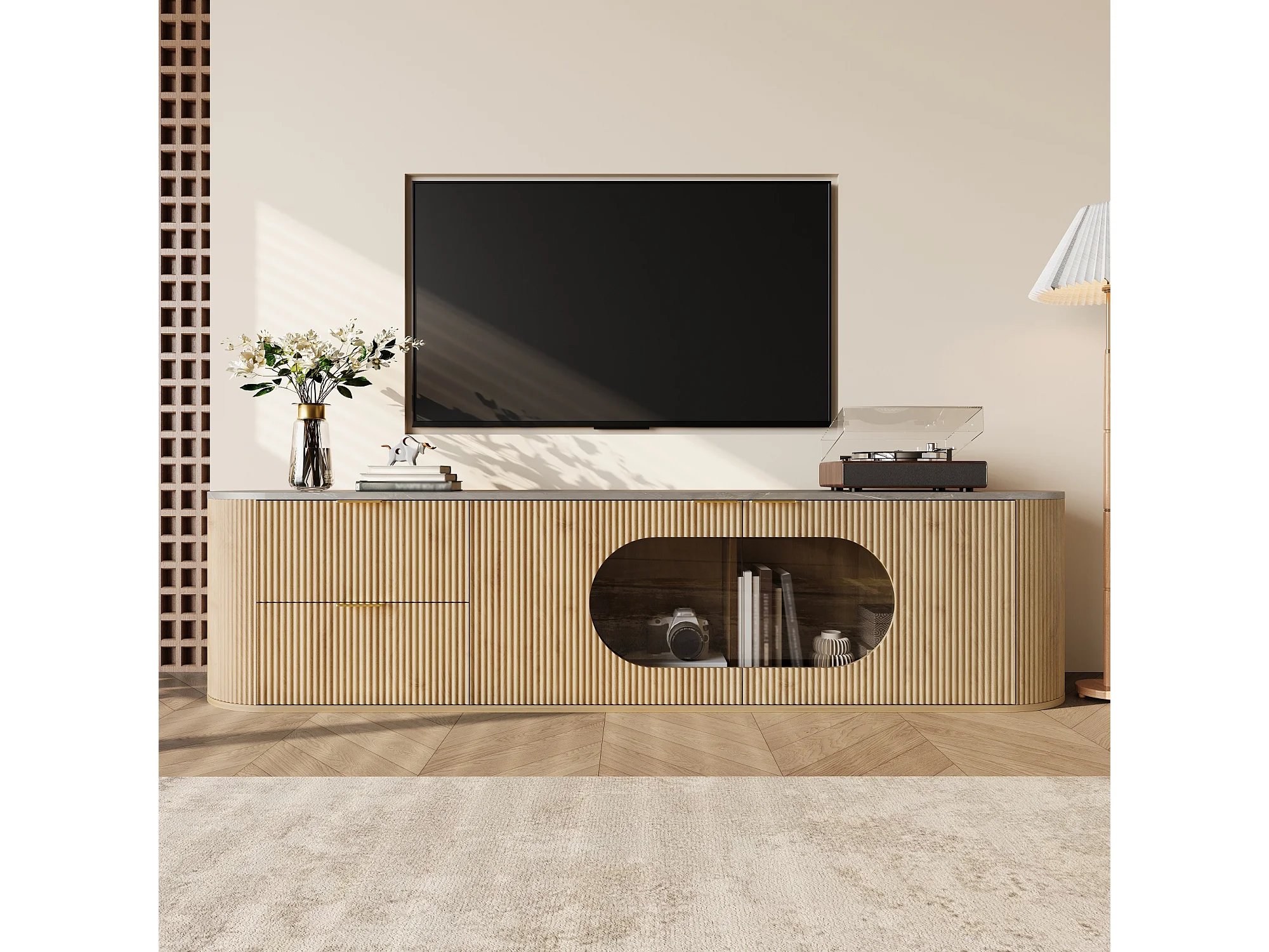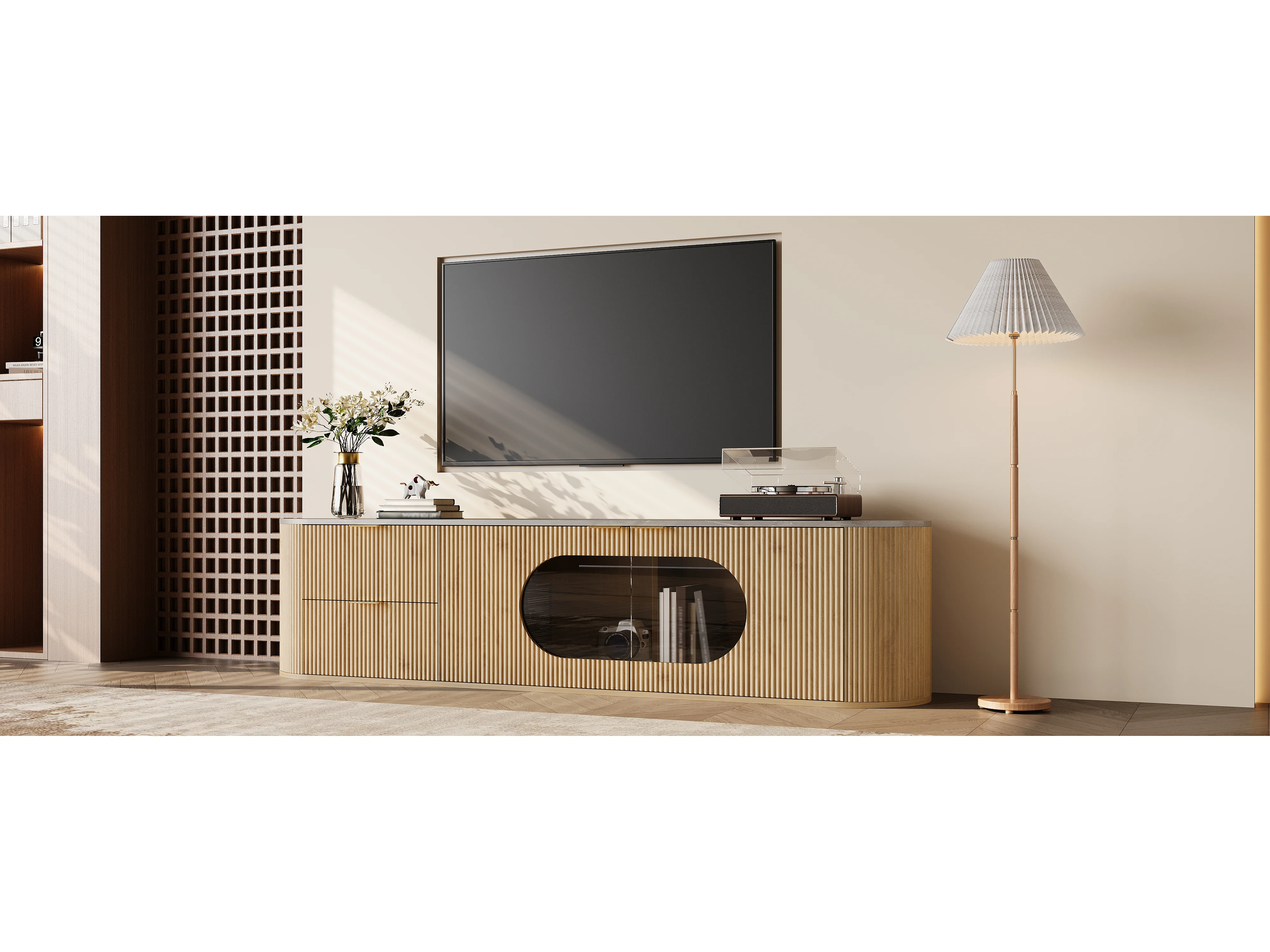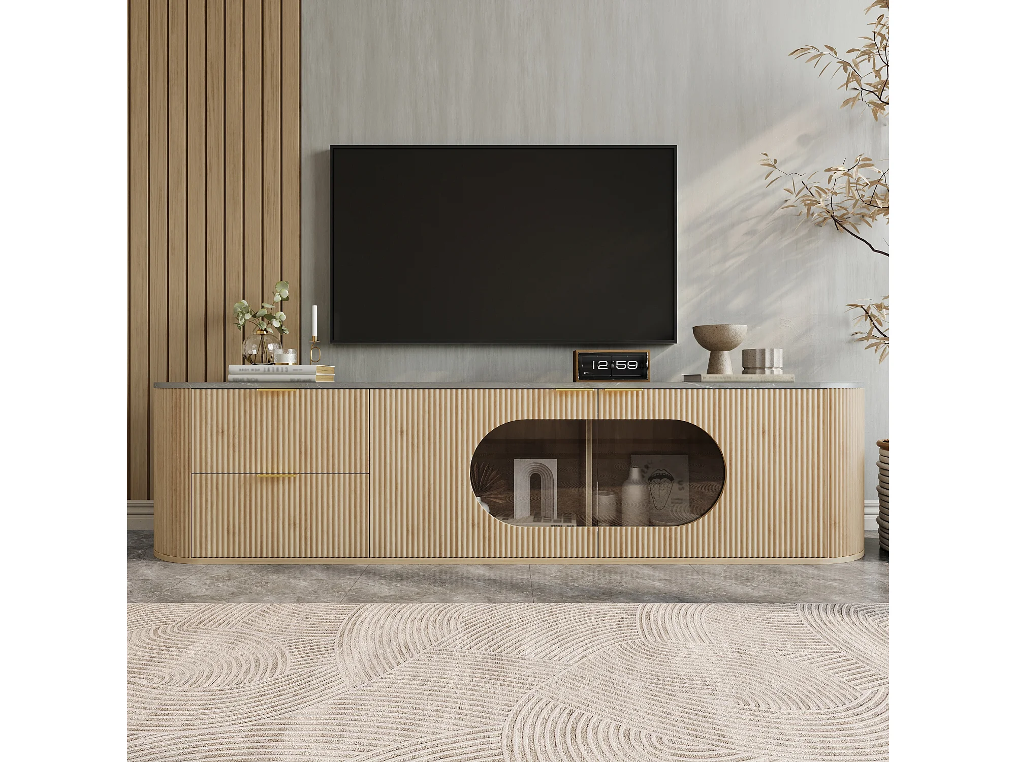 Meuble TV moderne et minimaliste aspect bois - 172 x 38 x 45.5 cm - avec 2 portes en verre + 2 tiroirs - MDF + verre - naturel clair