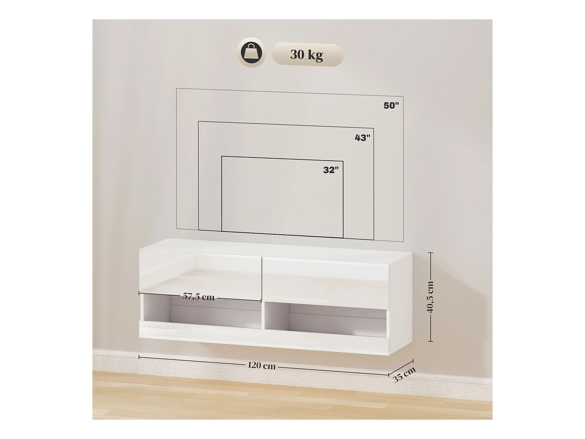 Meuble TV mural 120x35x40,5cm, éclairage LED, 16 modes, blanc brillant