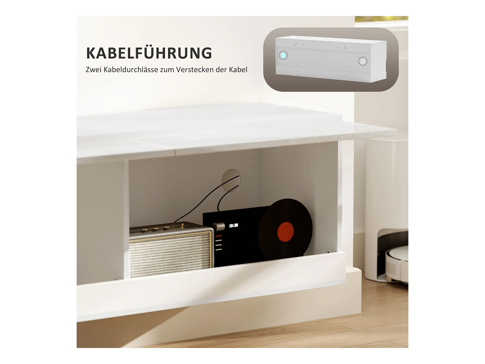 Meuble TV avec 2 tiroirs et 2 portes coulissantes, aspect blanc/bois, 160 x 40 x 58 cm. Texture raffinée et rangement pratique.