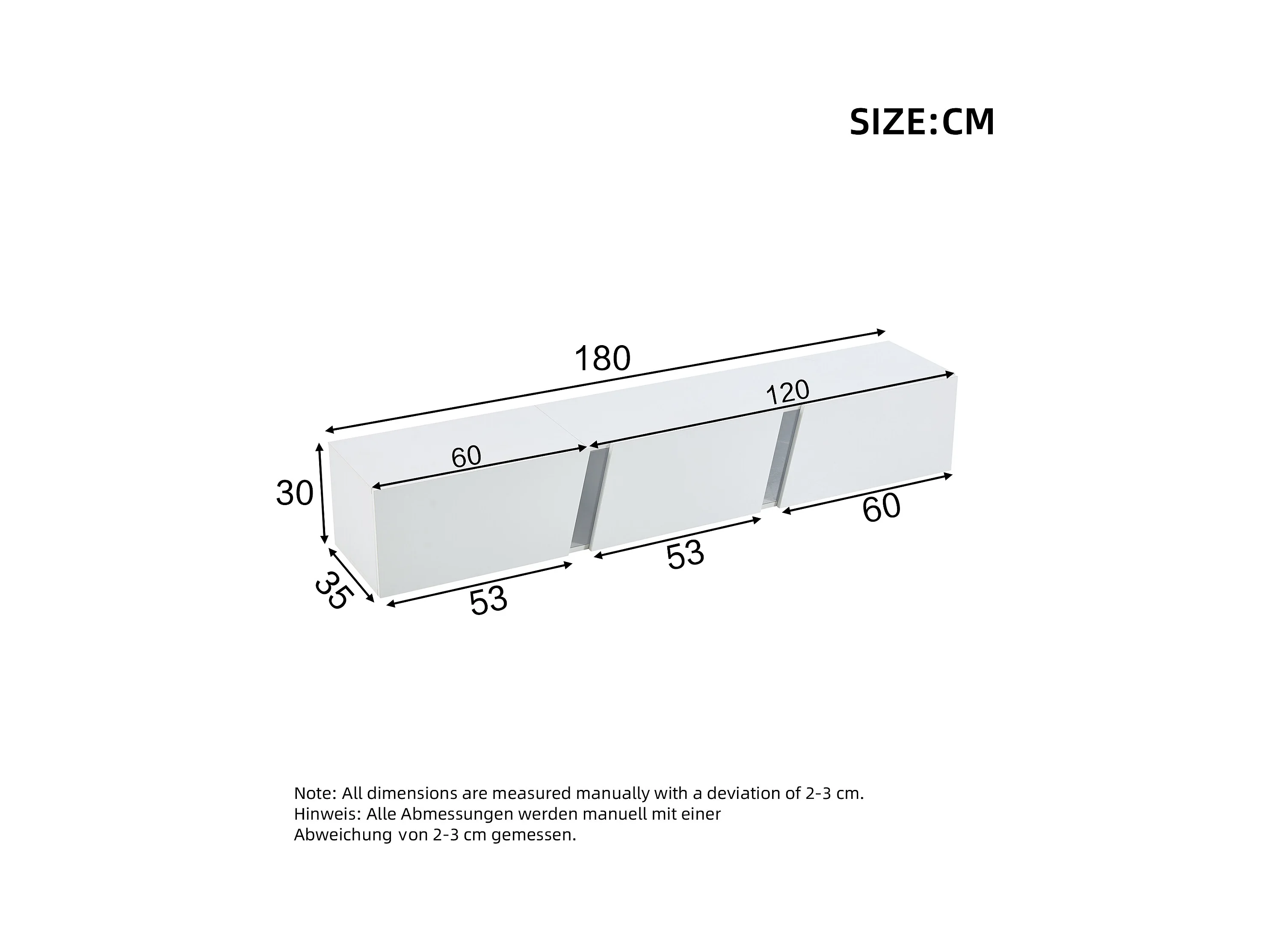 Meuble TV suspendu - 180 x 35 x 30 cm - avec Leds + 3 portes - pour TV 75 pouces - Aggloméré + Acrylique - blanc