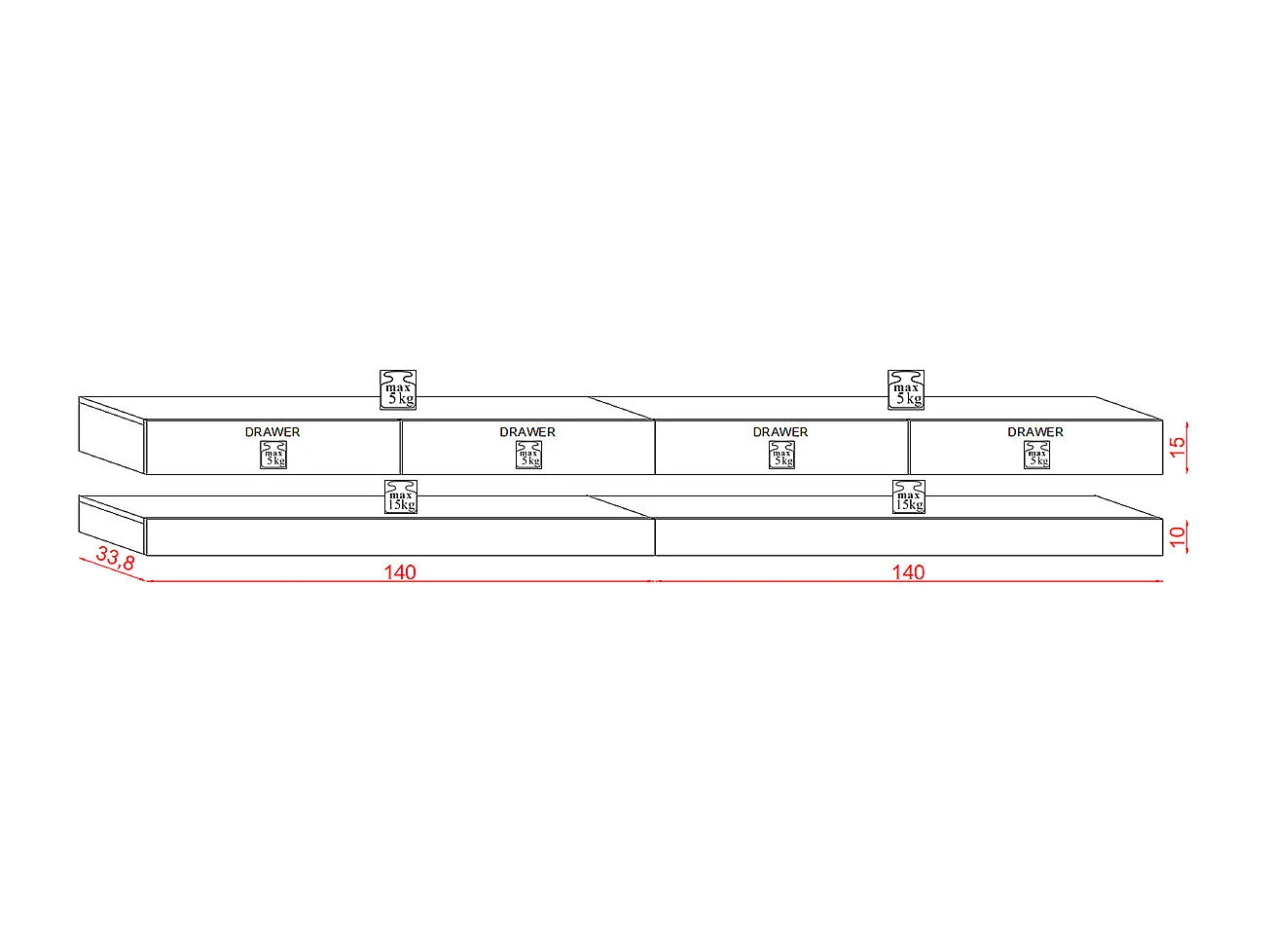 RTV Fly DOUBLE 280 avec quatre tiroirs blancs et devant blanc brillant +LED