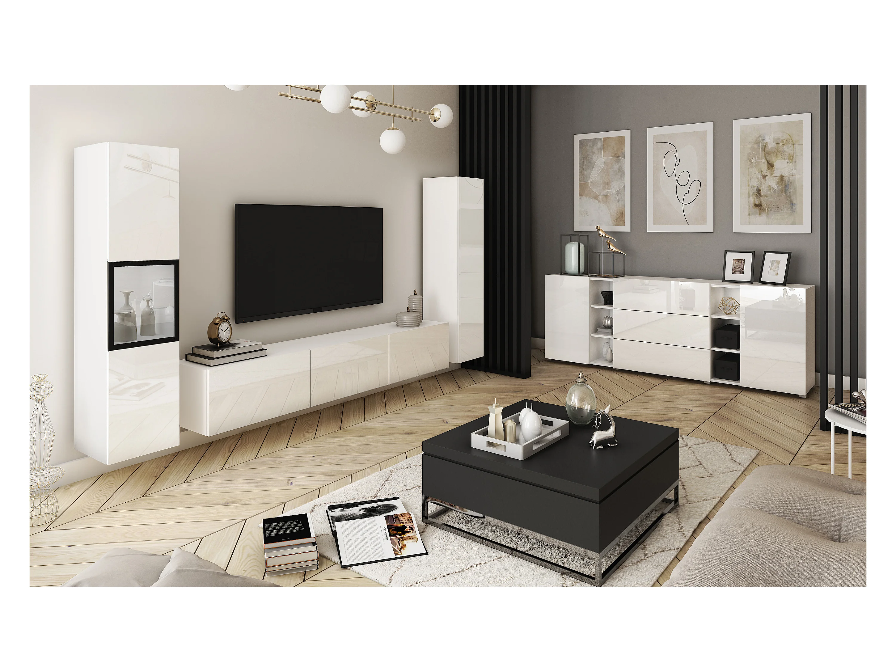 Mur TV moderne – ensemble suspendu et posé 2 éléments avec meuble TV 180 cm et vitrine, caisson blanc mat, façades blanc brillant