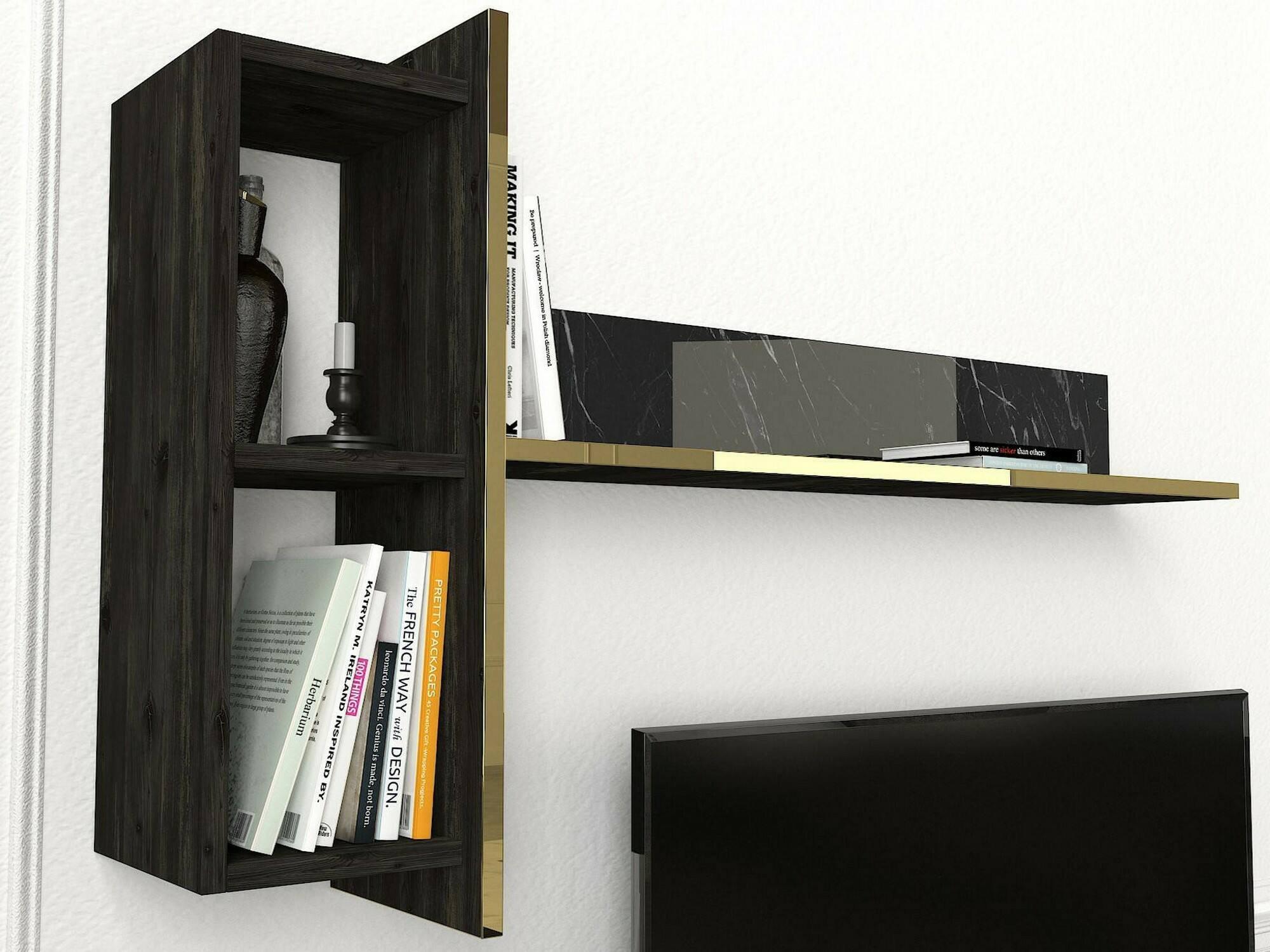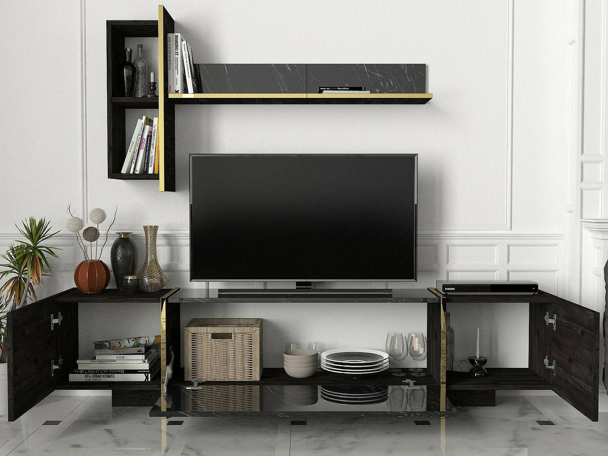 Meuble TV Centaurus, Buffet de salon, Armoire basse pour TV, Base murale de rangement, 180x30h50 cm, Anthracite et Or