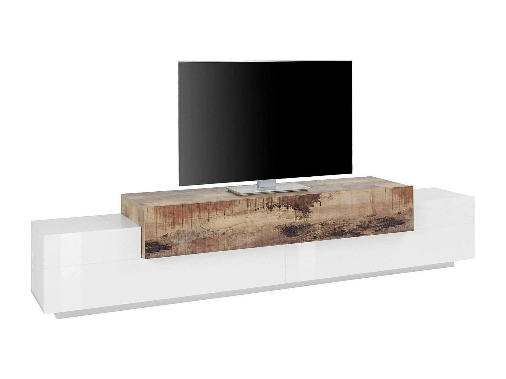 Meuble TV Teo, Buffet bas de salon, Base pour meuble TV, 100% Made in Italy, 200x45h52 cm, Blanc brillant et érable