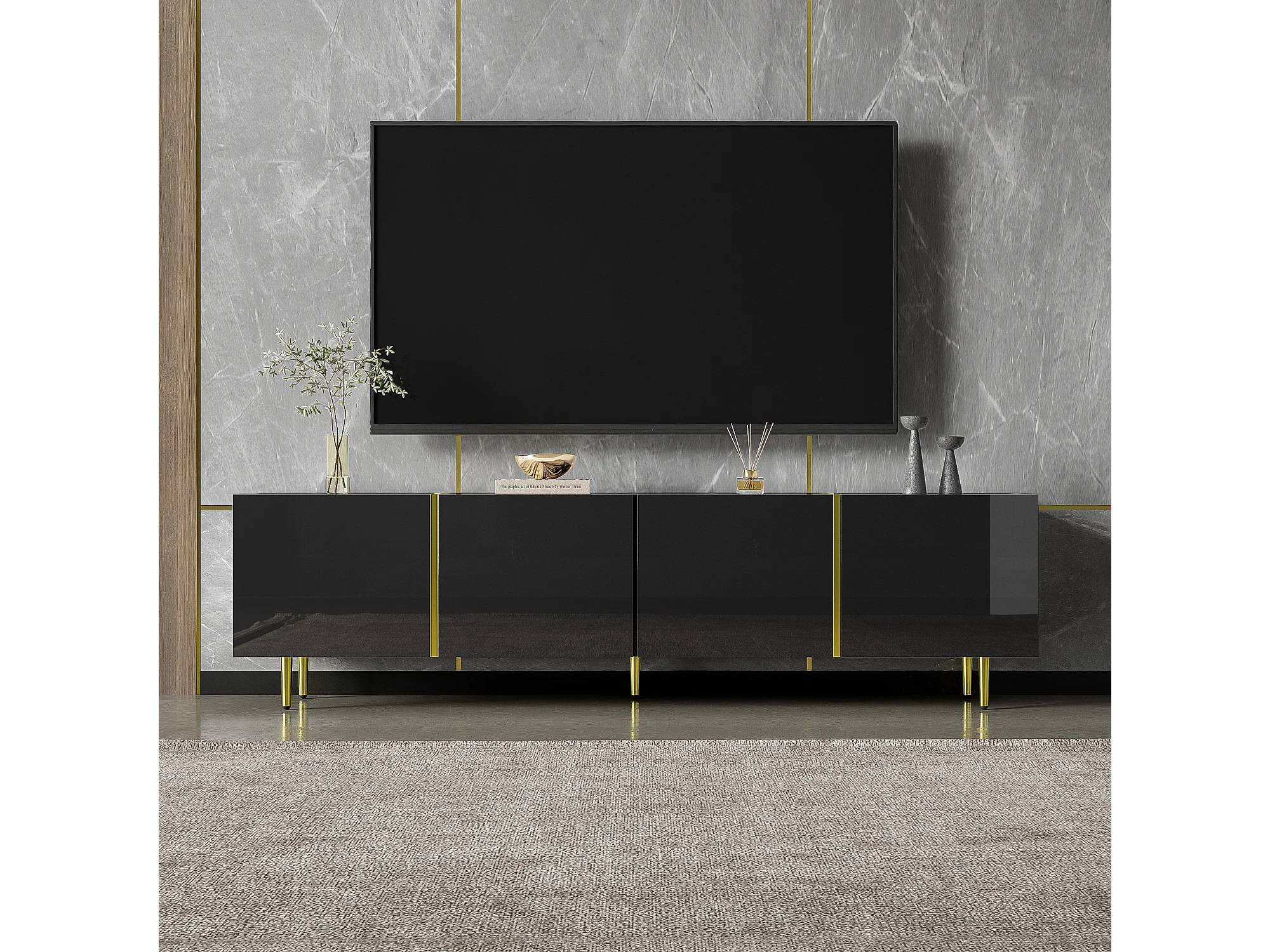 Meuble TV Noir, Banc TV avec 4 Portes, Meuble Télé de Salon avec Lignes Dorées, 170x35x46cm