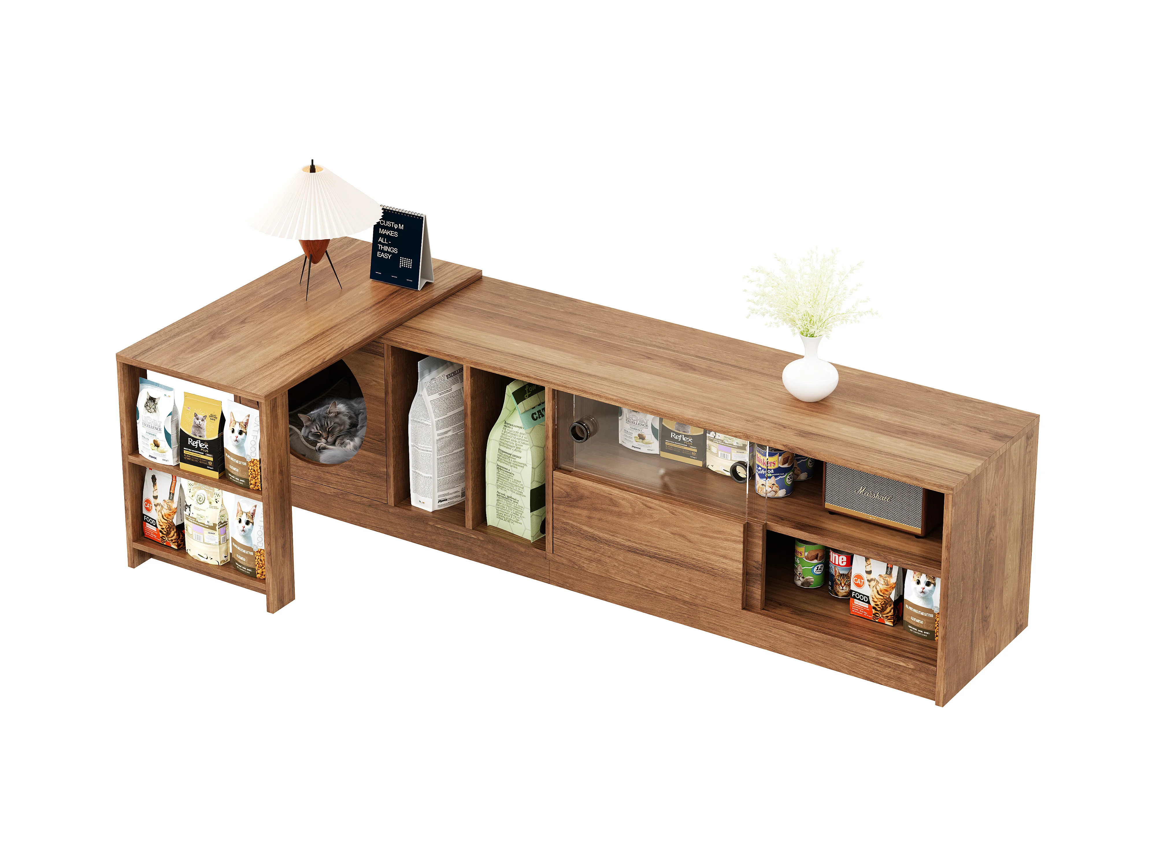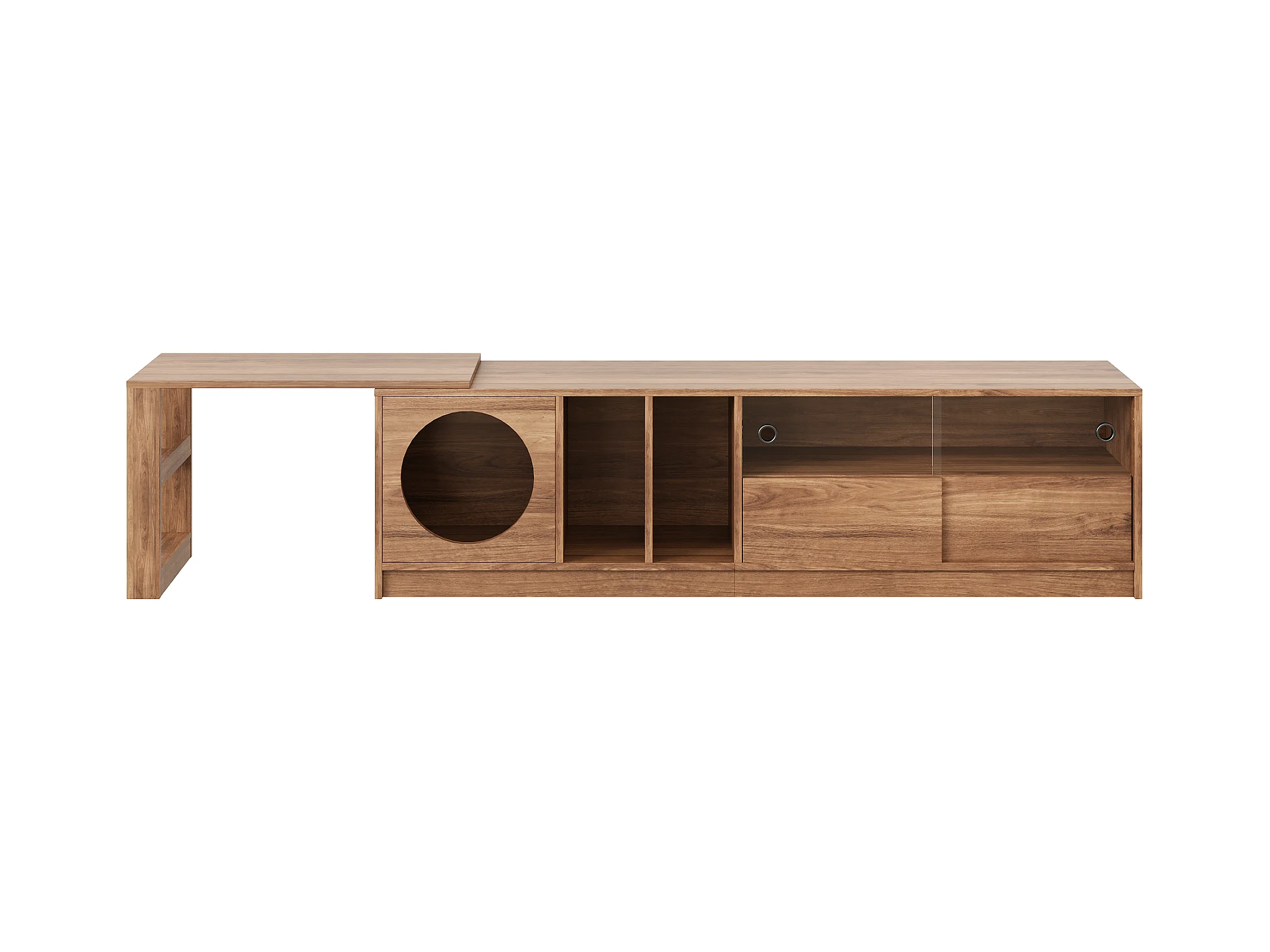 Meuble TV pivotant - 180(+80) x 40 x 51.5 cm - avec coin repos pour chat + portes - MDF - naturel