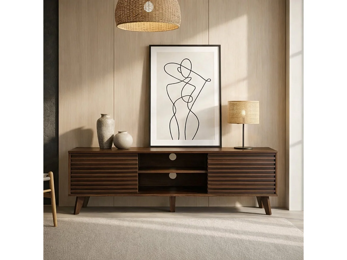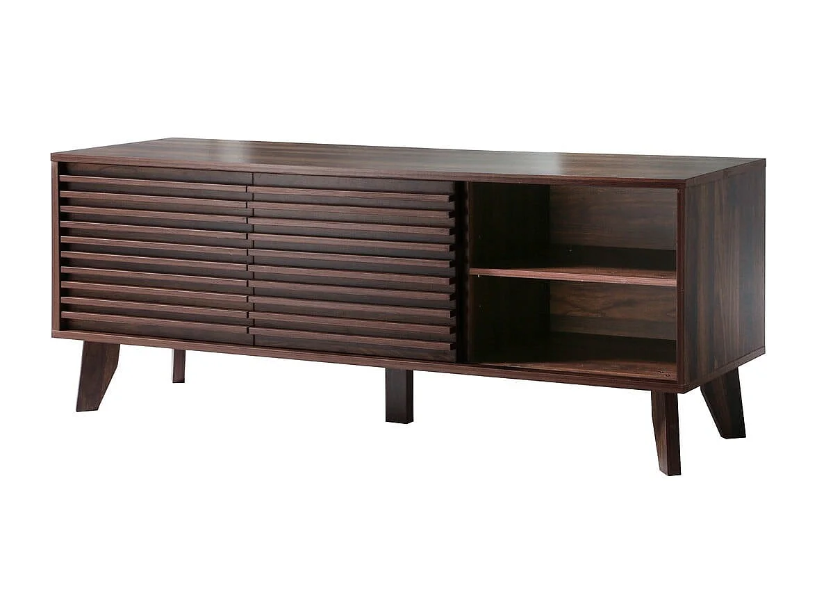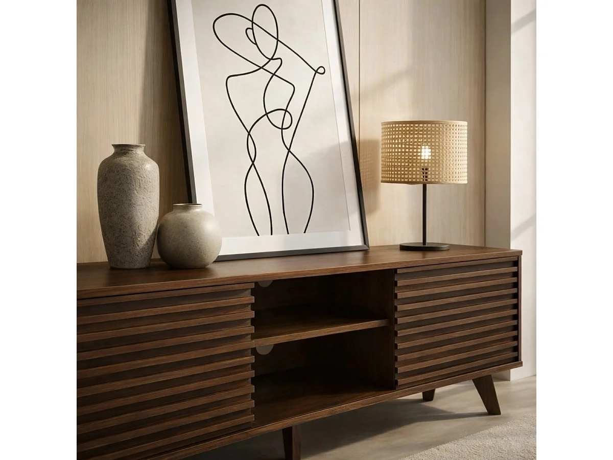 Meuble TV portes coulissantes Façades Effet Bois Rainuré L135 cm - FRIBOURG