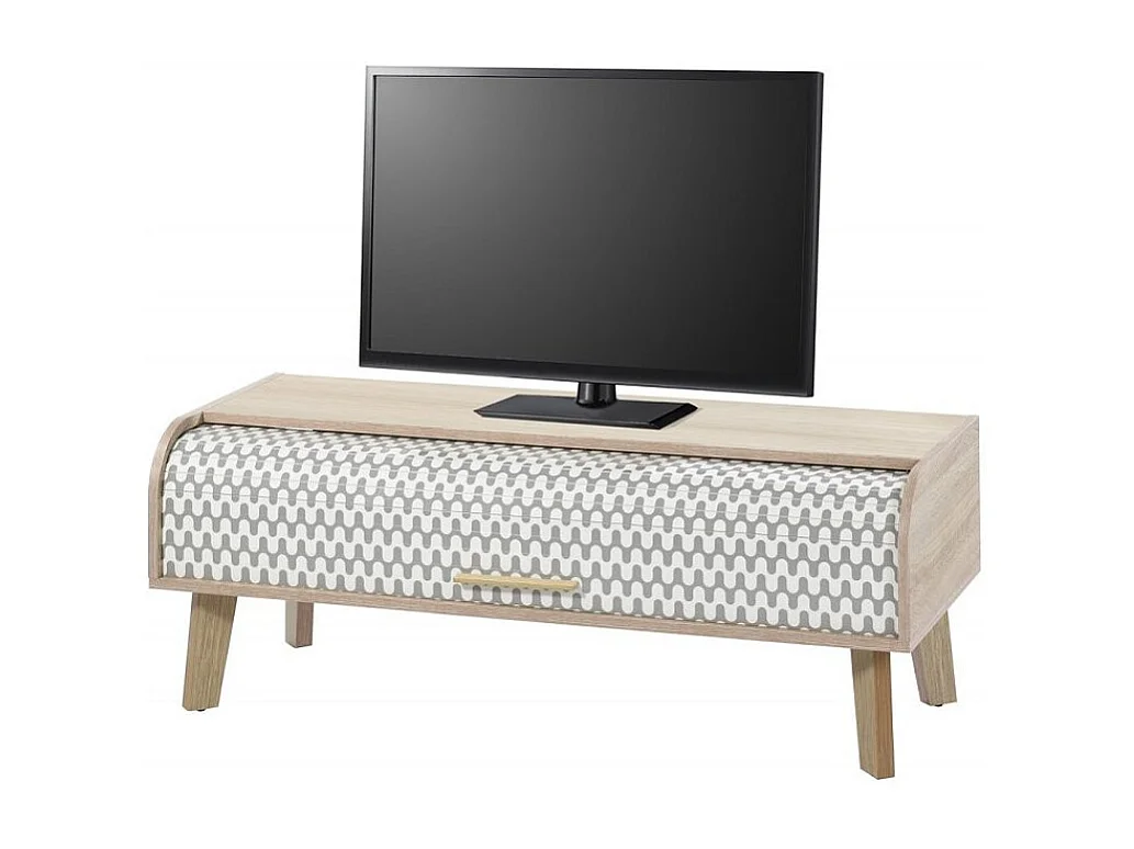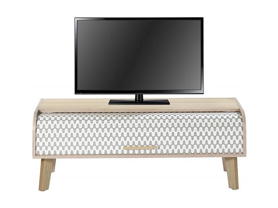 Meuble TV rideau chêne clair et rideau imprimé vague grise Happy 114cm