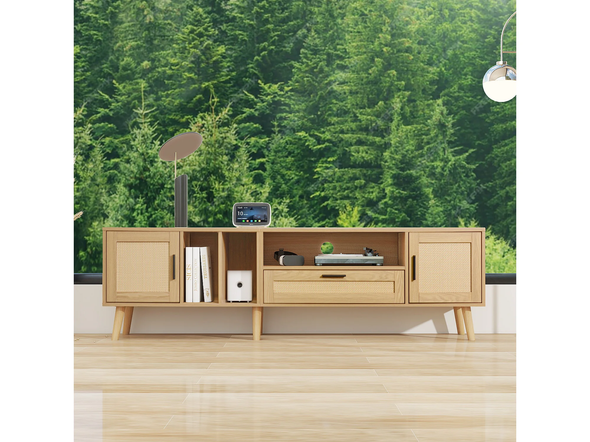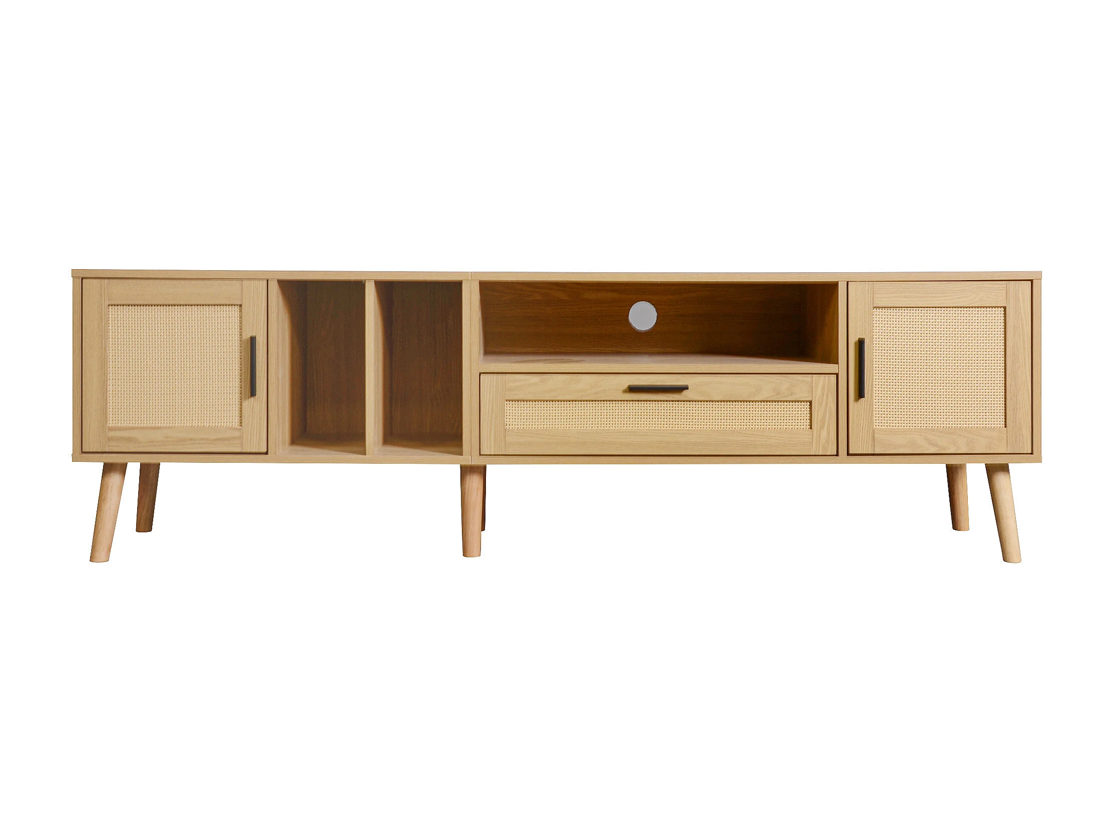 Meuble TV 200x37x48.5 cm salon 2 portes 2 tiroirs en rotin et rangement ouvert en bois - chêne