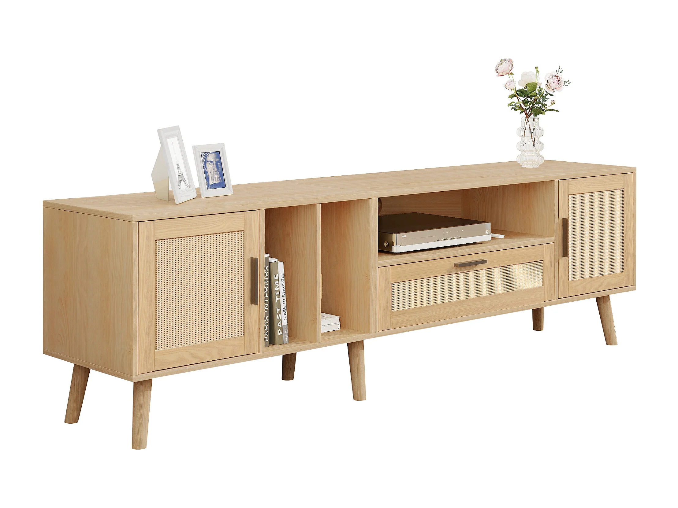 Meuble TV 180x40x54 cm avec 2 portes 1 tiroir en rotin meuble de rangement en bois - chêne