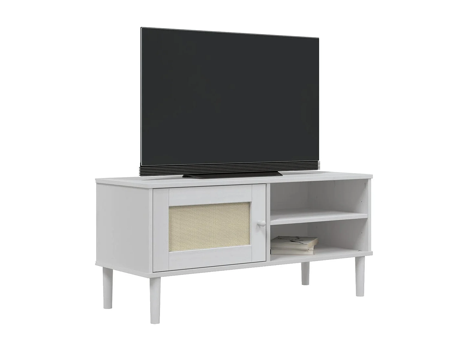 Meuble TV SENJA aspect rotin blanc 106x40x49cm bois massif pin BE65022