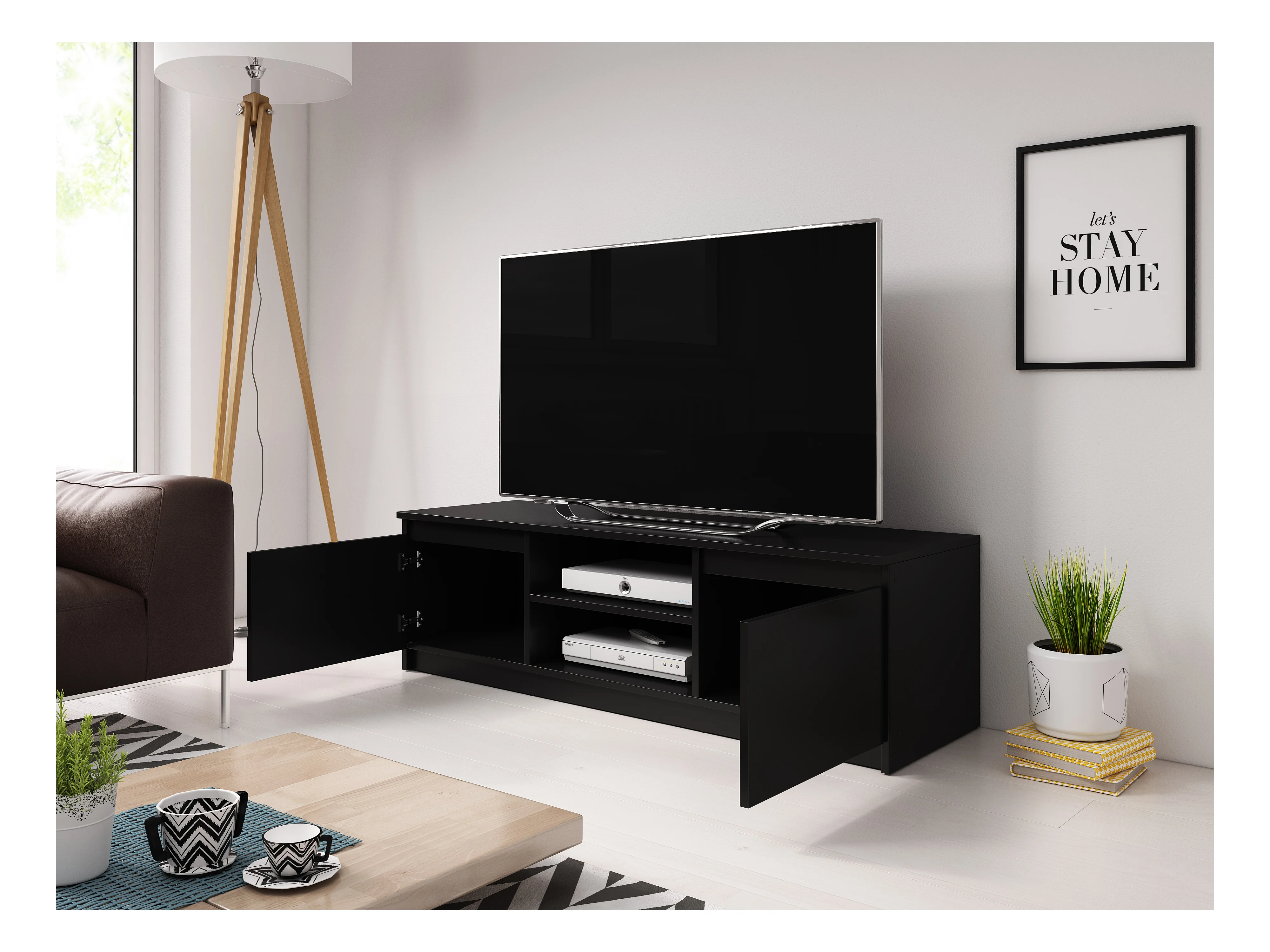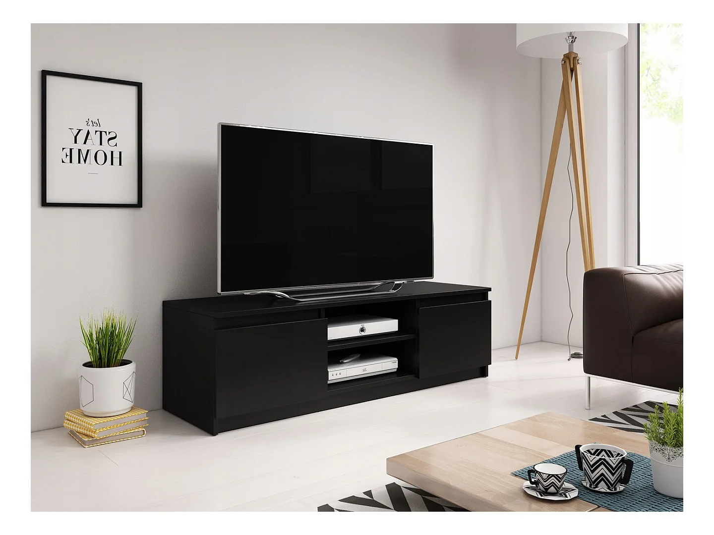 Meuble TV simple 120 cm avec LED, pour téléviseur, 2 placards et étagères, noir mat