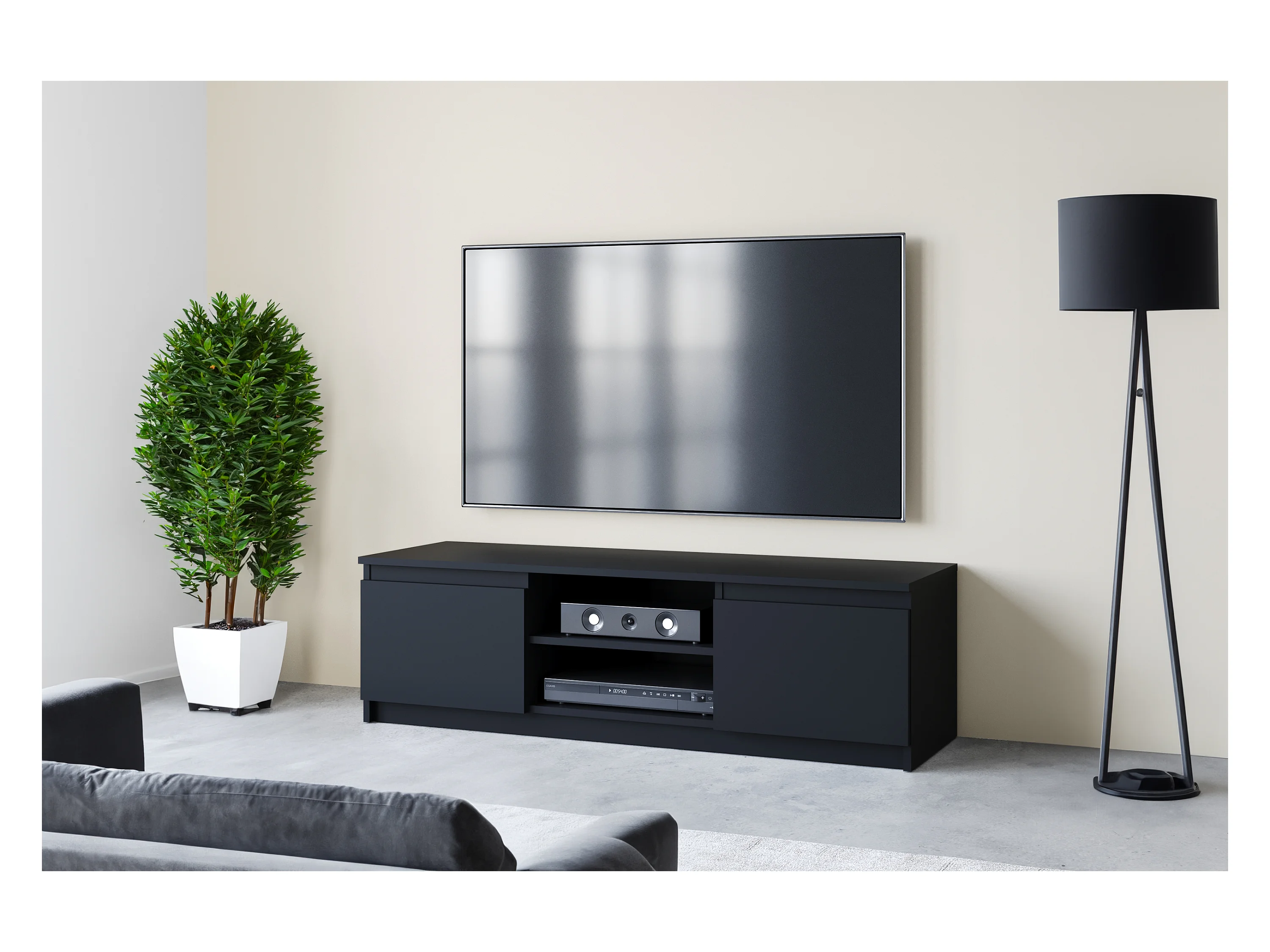 Meuble TV moderne 140 cm avec LED 2 portes, sans poignées, noir mat, posé ou suspendu