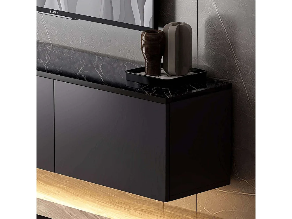 Meuble TV suspendu Ruxta L160cm Anthracite et Noir effet marbre