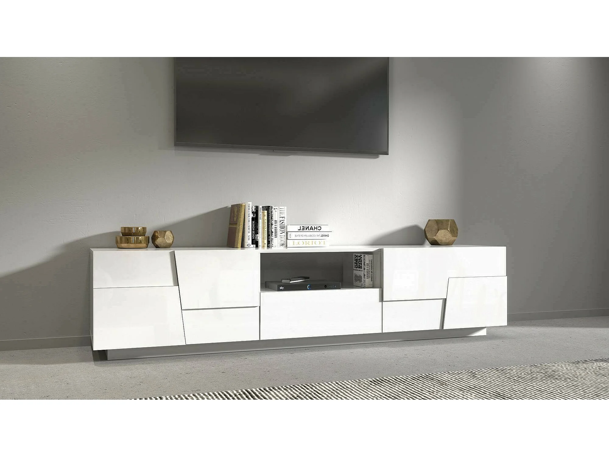 Meuble TV Vanni, Buffet bas de salon avec 4 portes et 1 tiroir, Base meuble TV, 220x44h46 cm, Blanc brillant