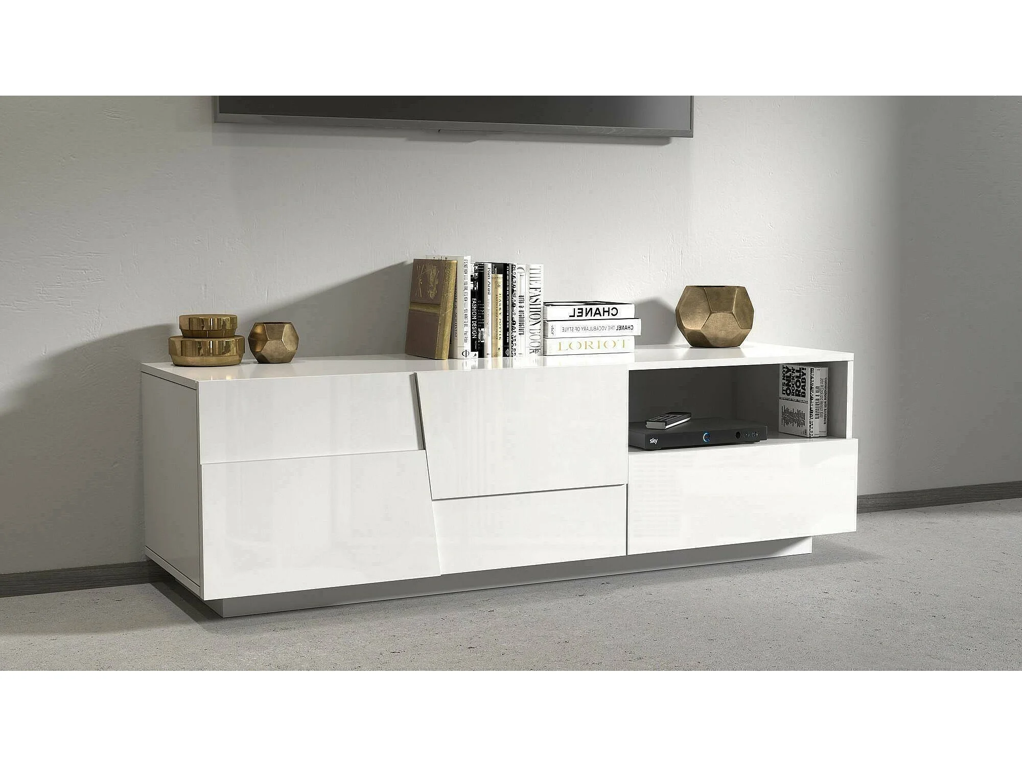 Meuble TV Velio, Buffet bas de salon avec 2 portes et 1 tiroir, Base meuble TV, 150x44h46 cm, Blanc brillant