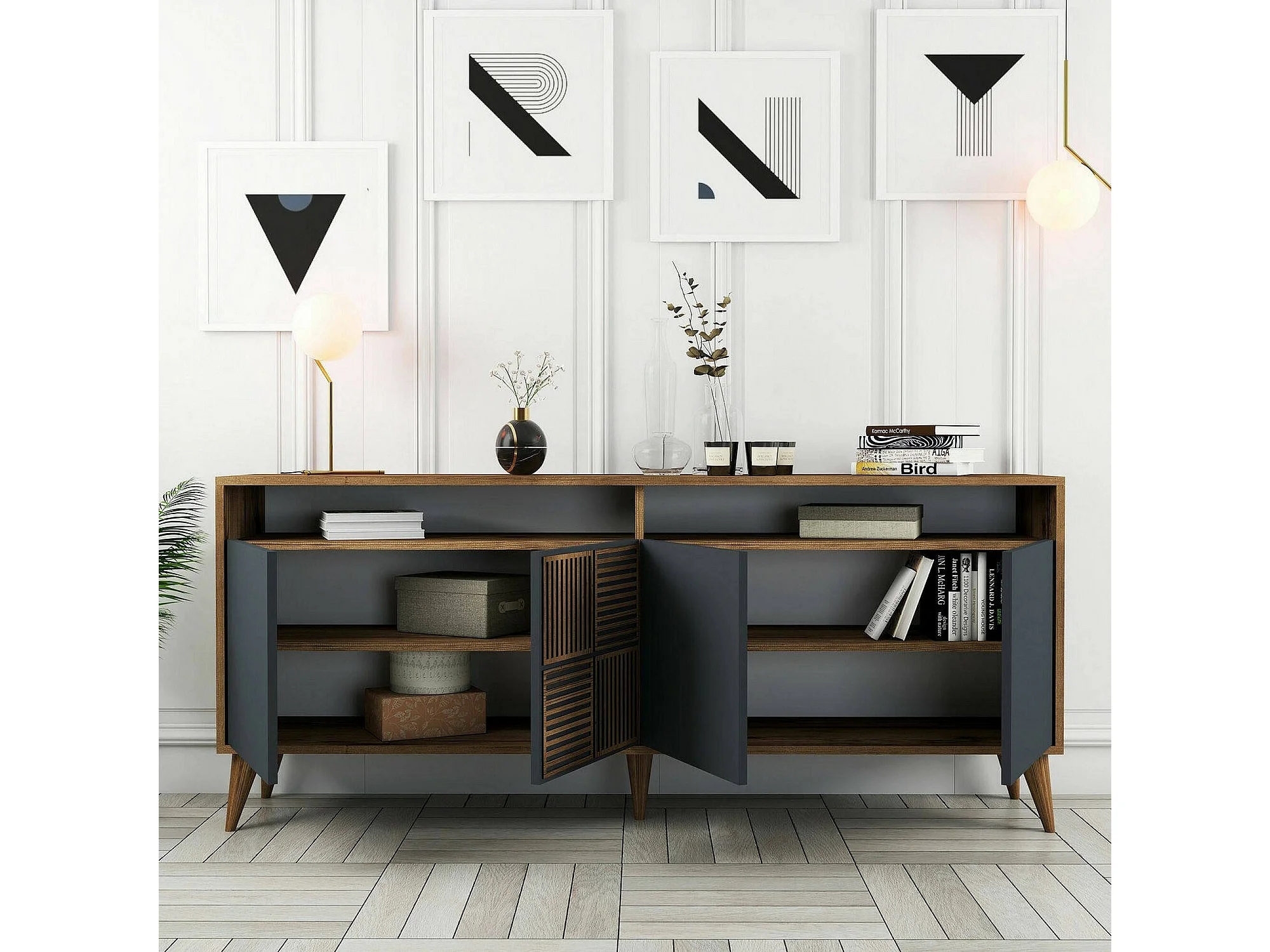 Meuble TV Virgo, Buffet de salon, Armoire basse pour TV, Base murale de rangement, 180x35 h79 cm, Noyer et Anthracite