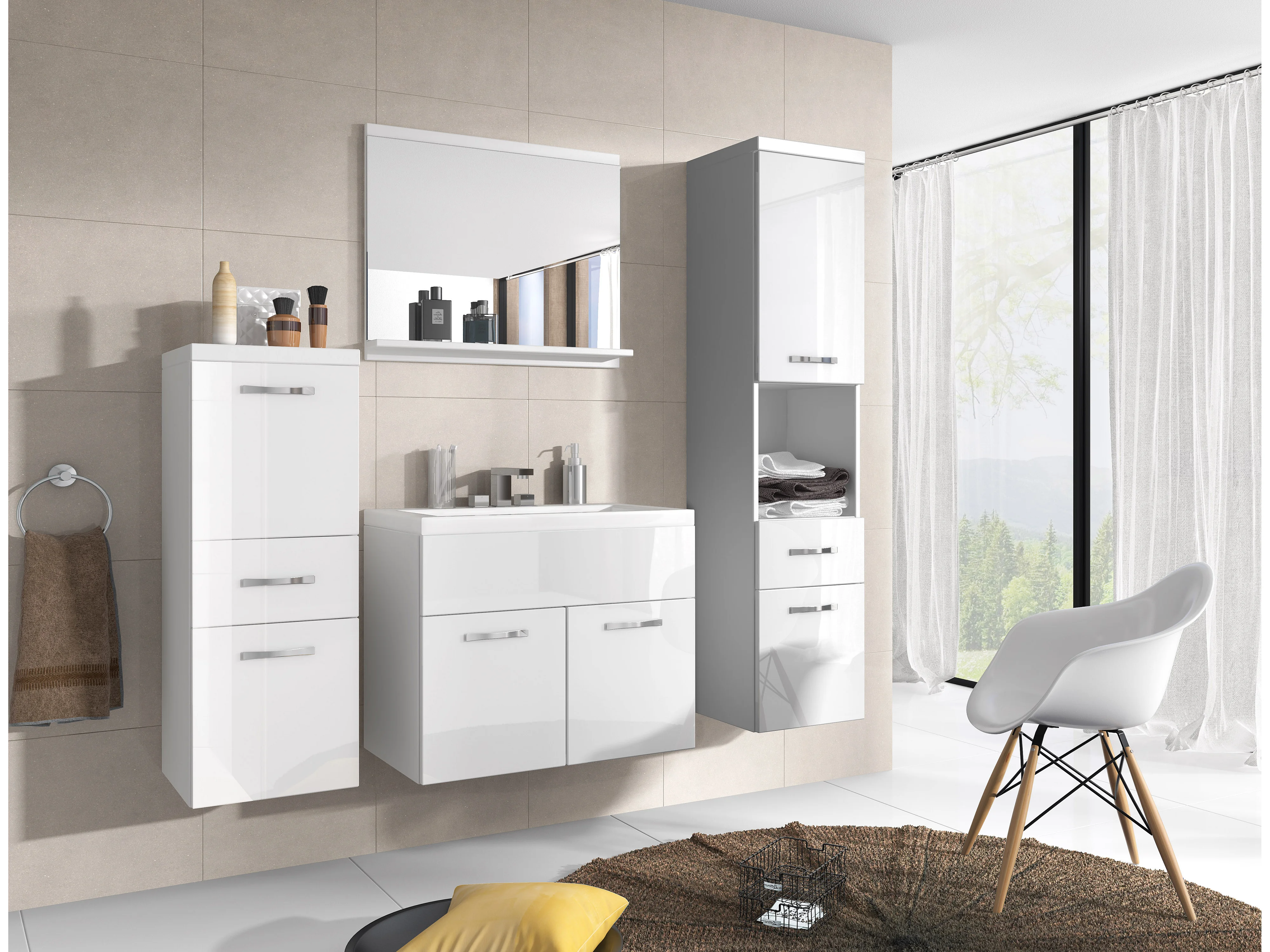 Ensemble de salle de bain suspendu avec lavabo, miroir et 2 colonnes, caisson blanc façades gris brillant