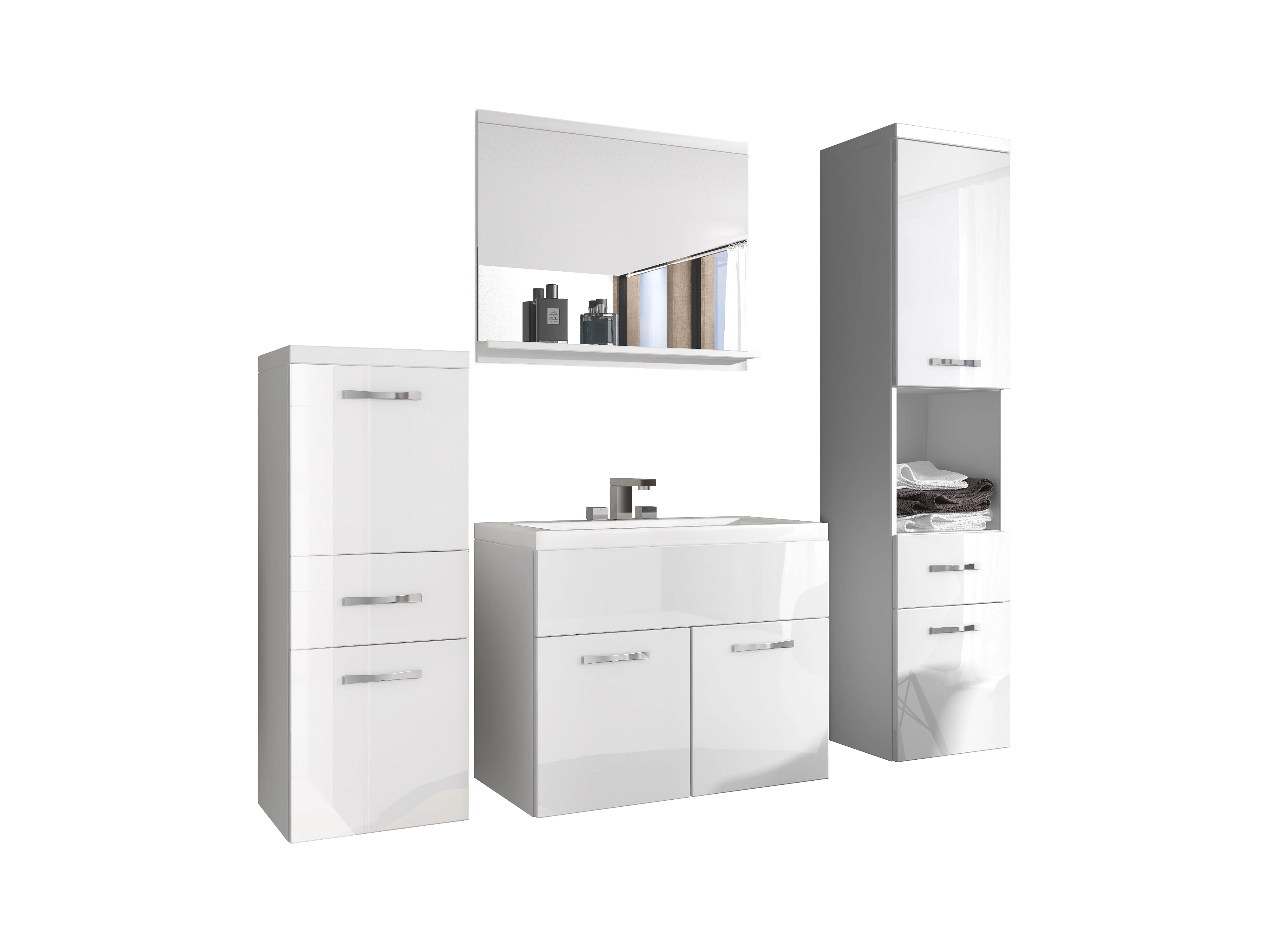 Ensemble de salle de bain suspendu avec lavabo, miroir et 2 colonnes, caisson blanc mat façades blanc brillant