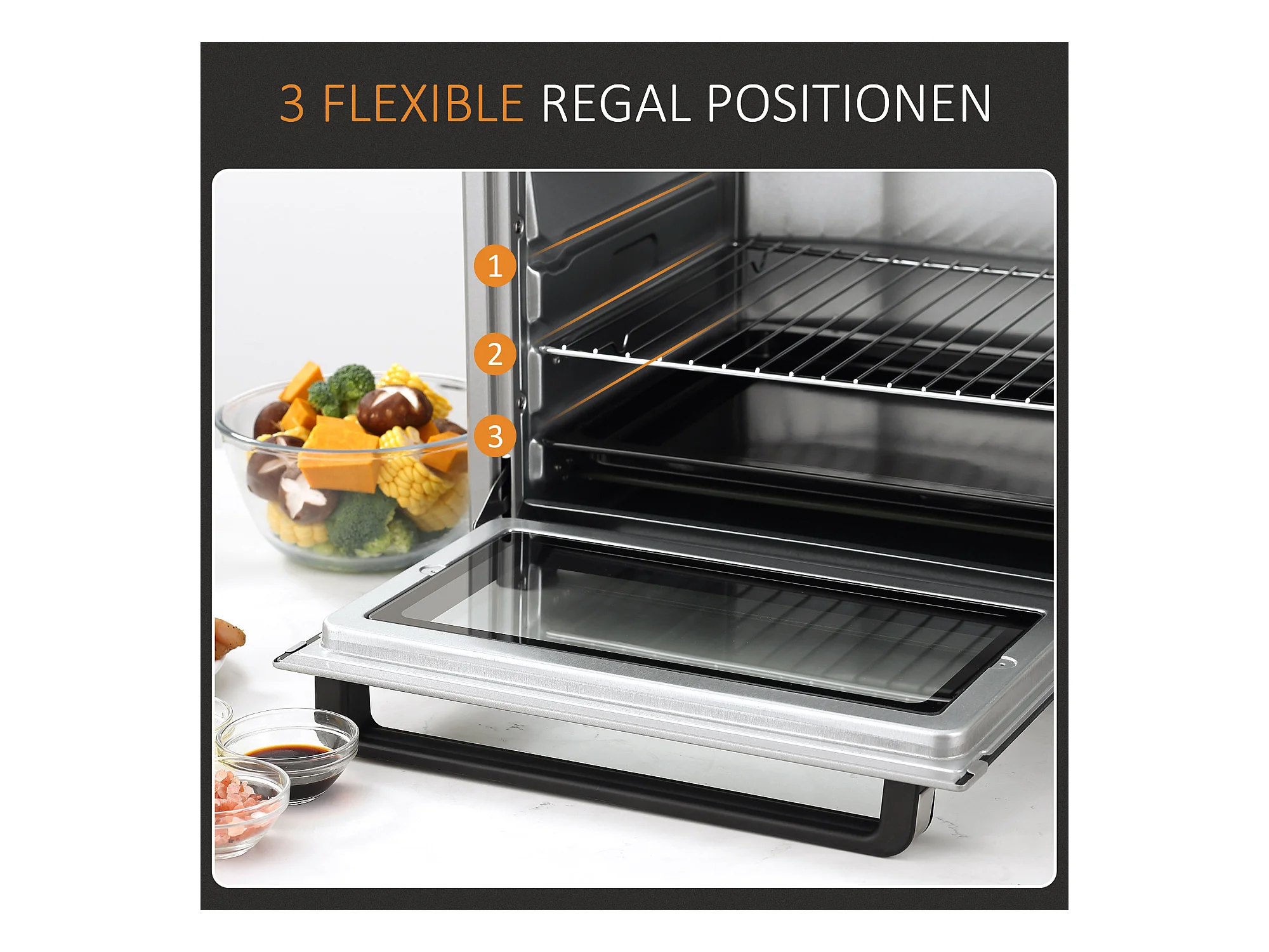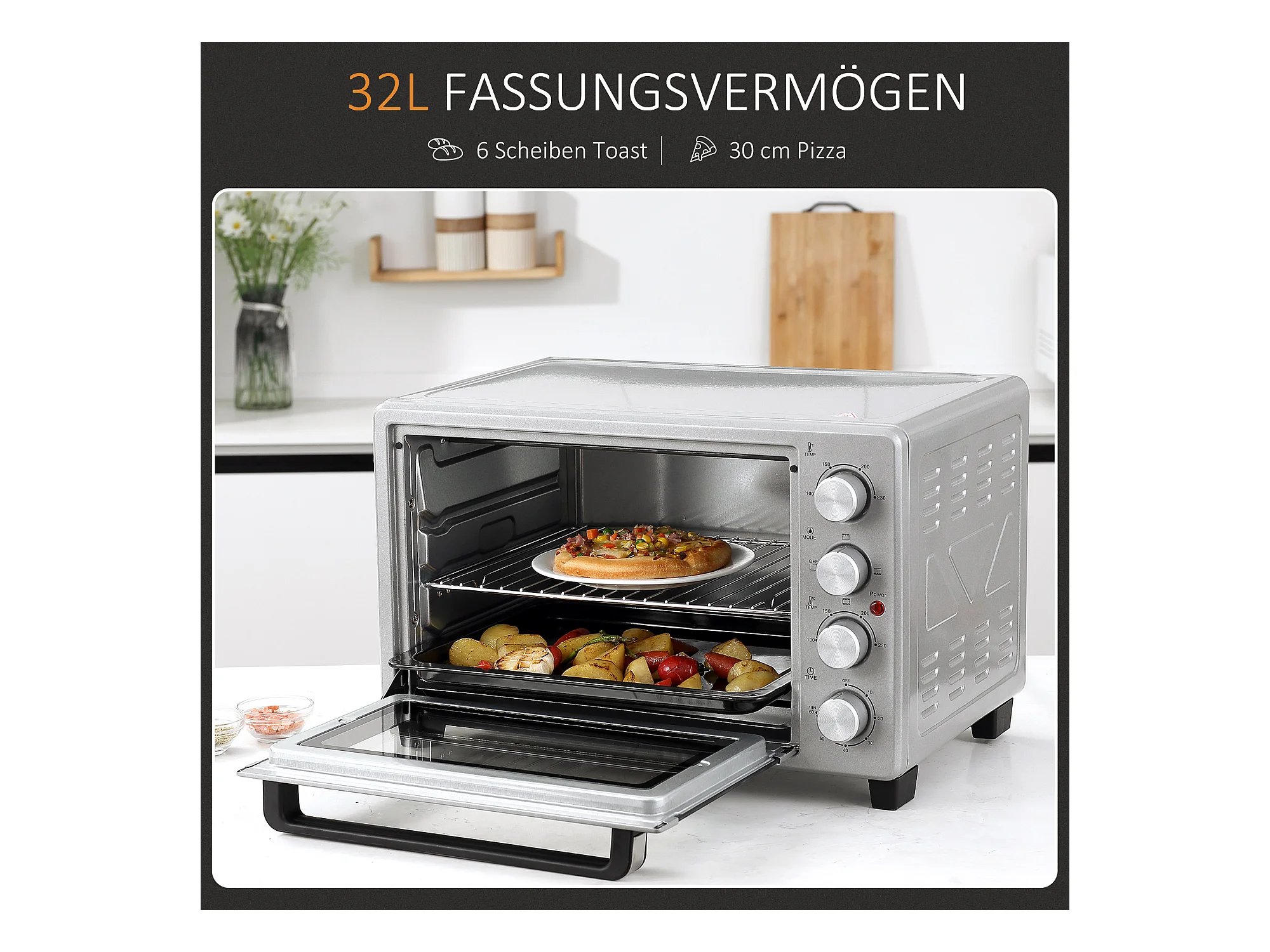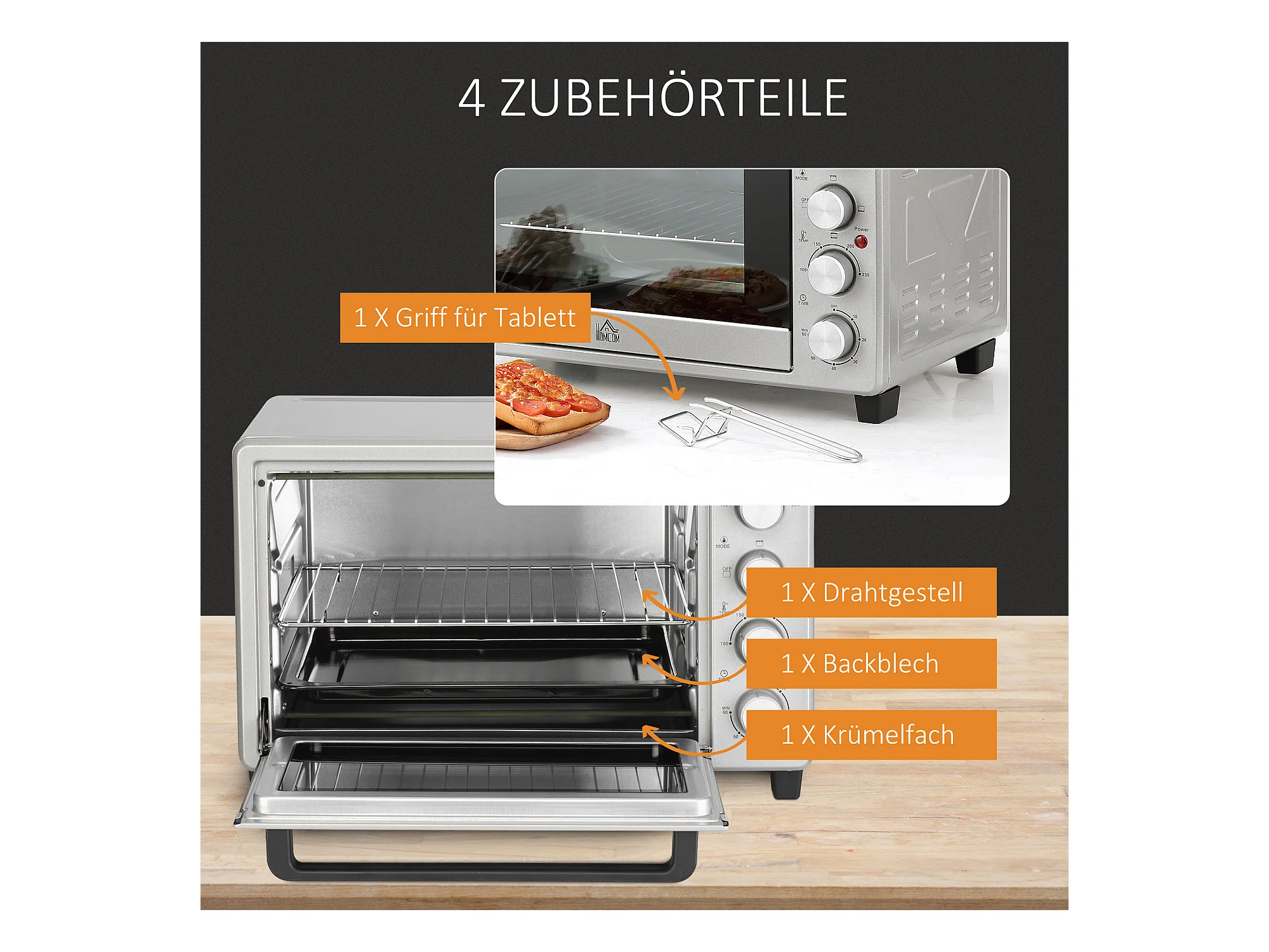 Mini four 32L, 1600W, 3 modes de cuisson, 100-230°C, avec 1h minuteur, plaque de cuisson, grilles et bac à miettes, métal, argenté (52.2x38.1x33.5cm)