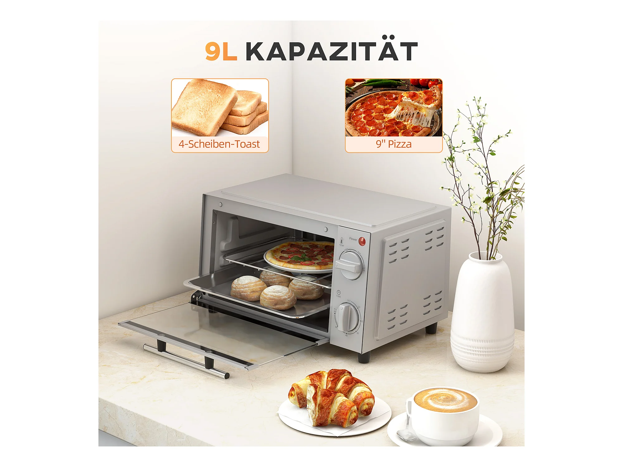 Mini four électrique 9L, température réglable 100-230°C, avec minuterie 60 min, grille et plaque de cuisson, métal, argenté (36.5x26x22cm)