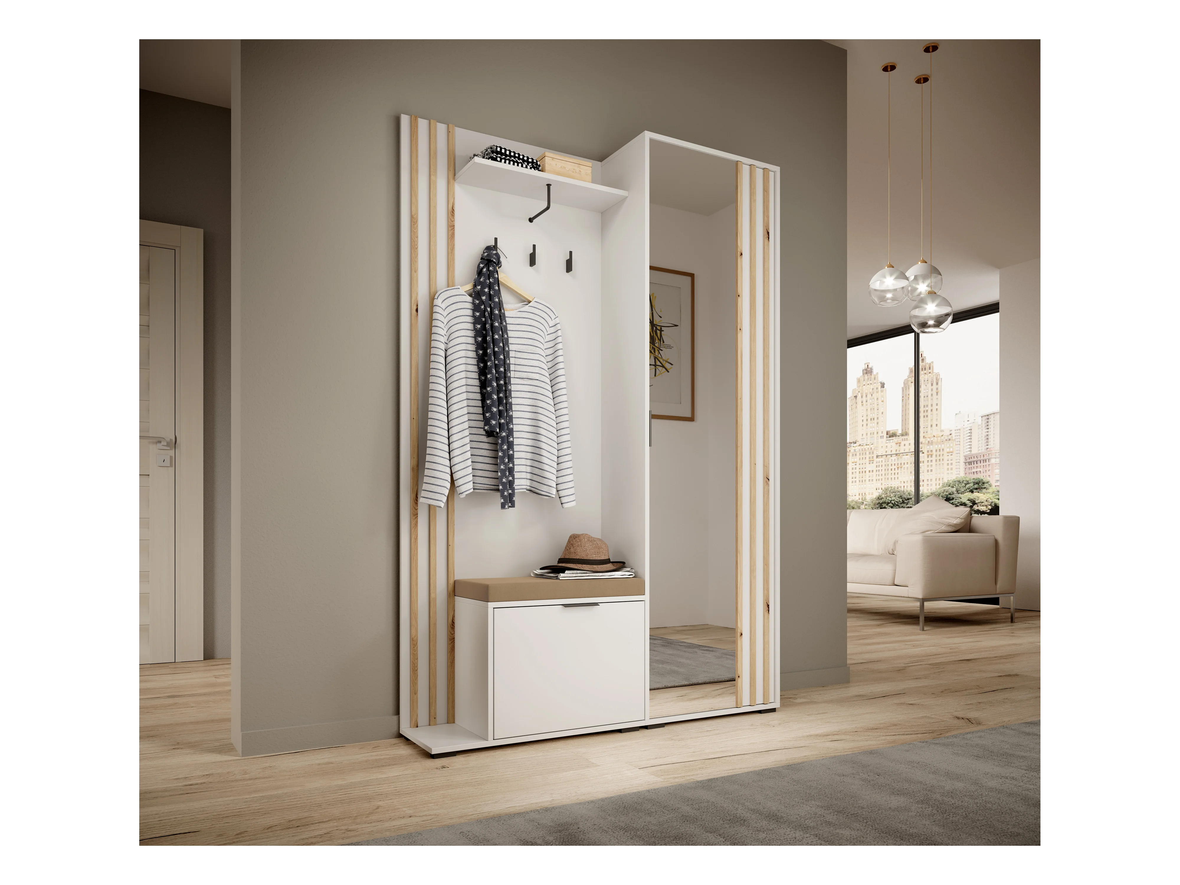 Armoire moderne armoire dentrée avec miroir assise et étagères chêne wotan mat