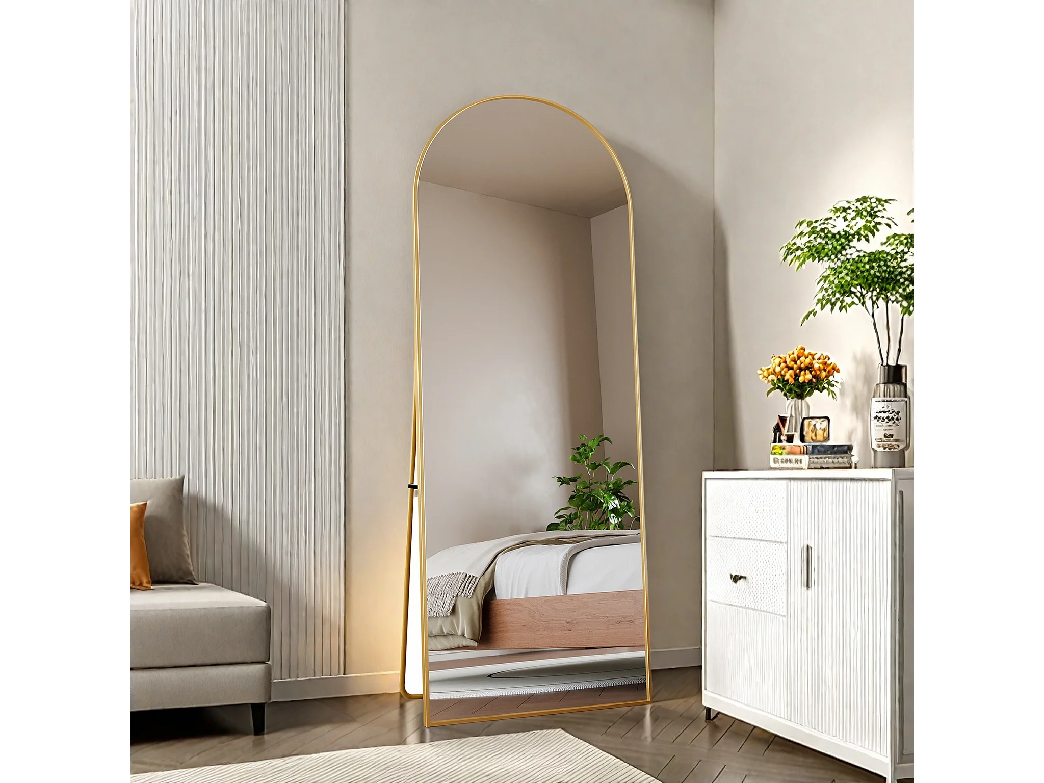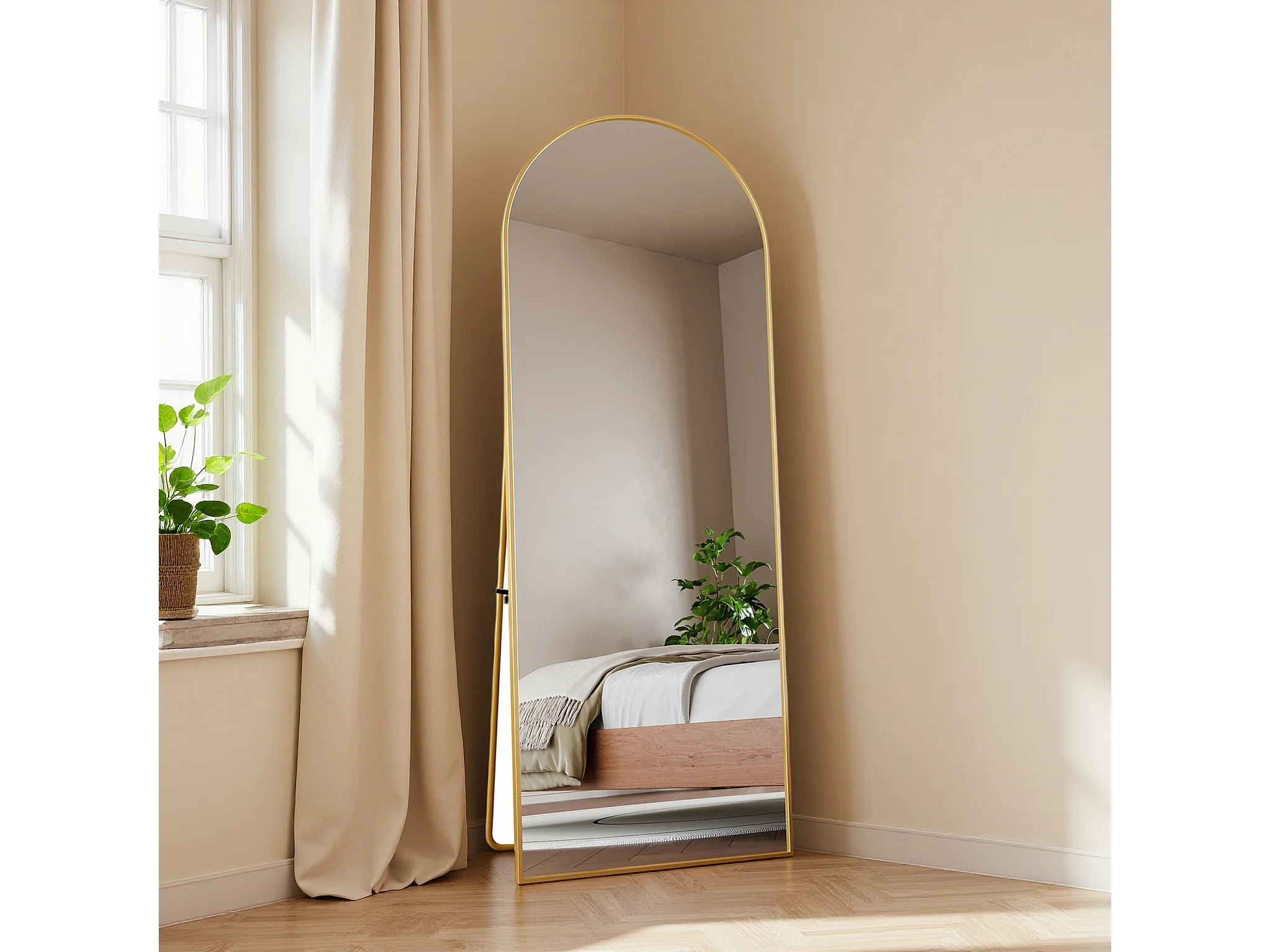 Miroir de maquillage arqué en verre trempé, cadre en aluminium doré, 1620x530 mm, design moderne élégant pour chambre, dressing ou salle de bain