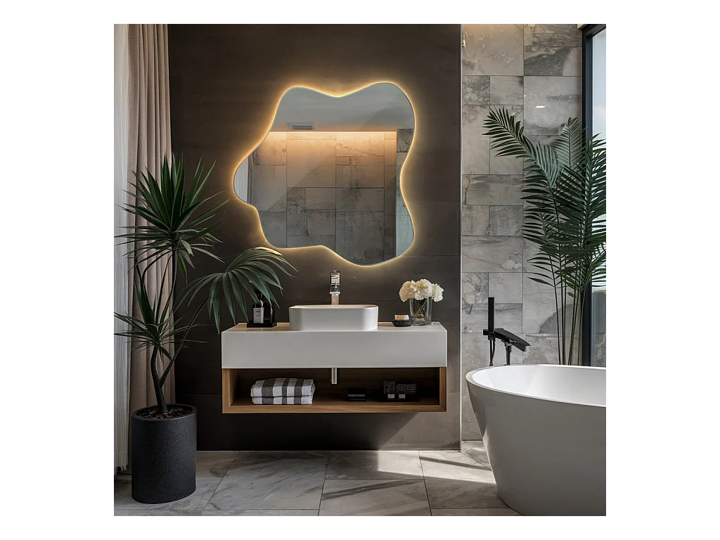 Miroir mural asymétrique moderne avec lumière LED froide, idéal pour décoration minimaliste et ambiance contemporaine - 67,6 cm x 67 cm