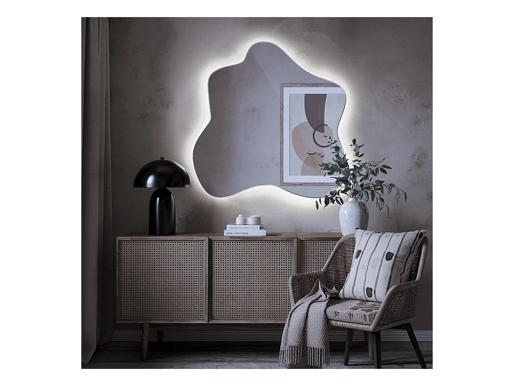 Miroir mural asymétrique moderne avec lumière LED froide, idéal pour décoration minimaliste et ambiance contemporaine - 67,6 cm x 67 cm