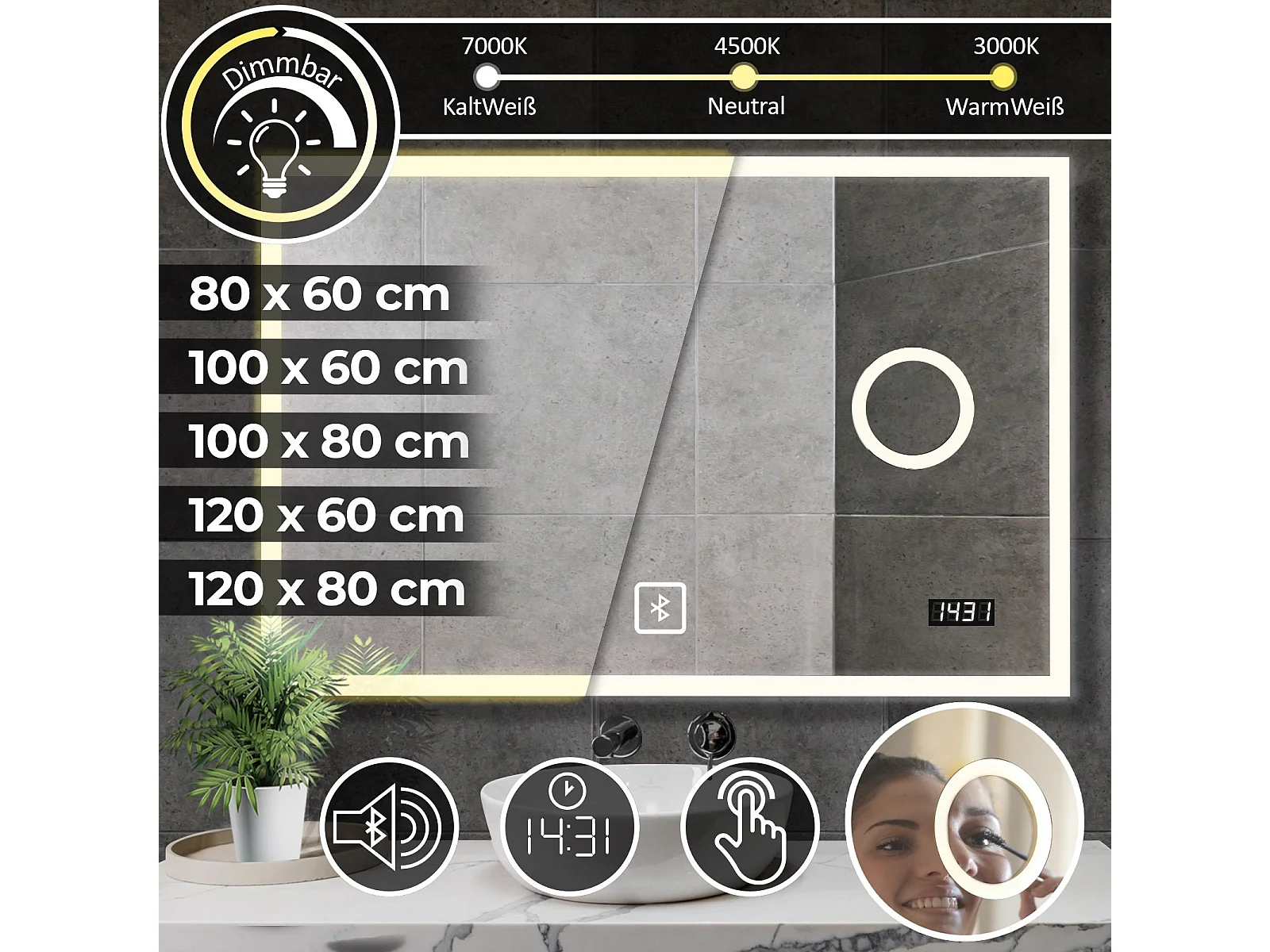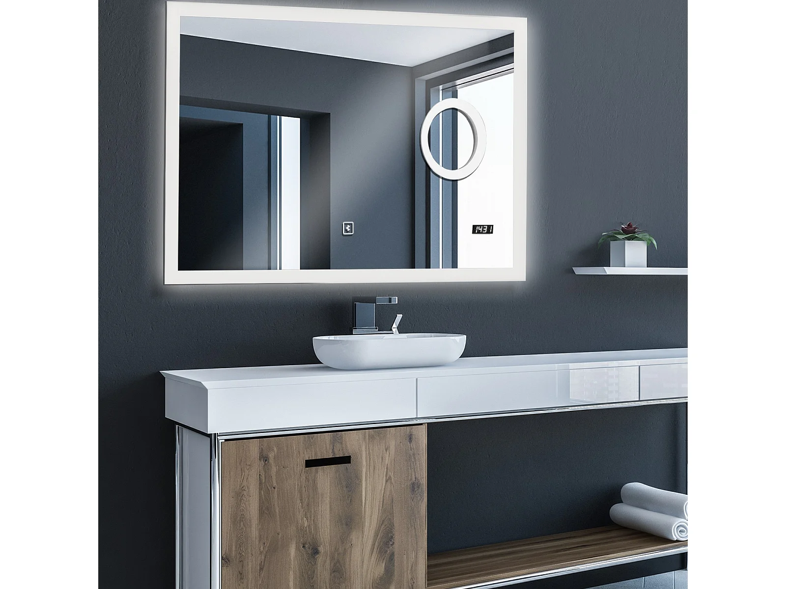 Miroir LED - 100x80 cm - avec haut-parleur Bluetooth + miroir de maquillage + horloge digitale