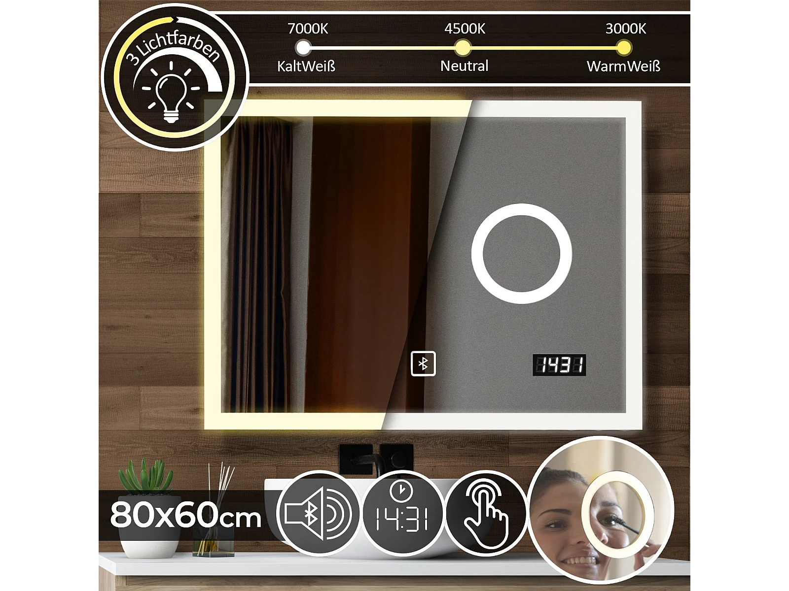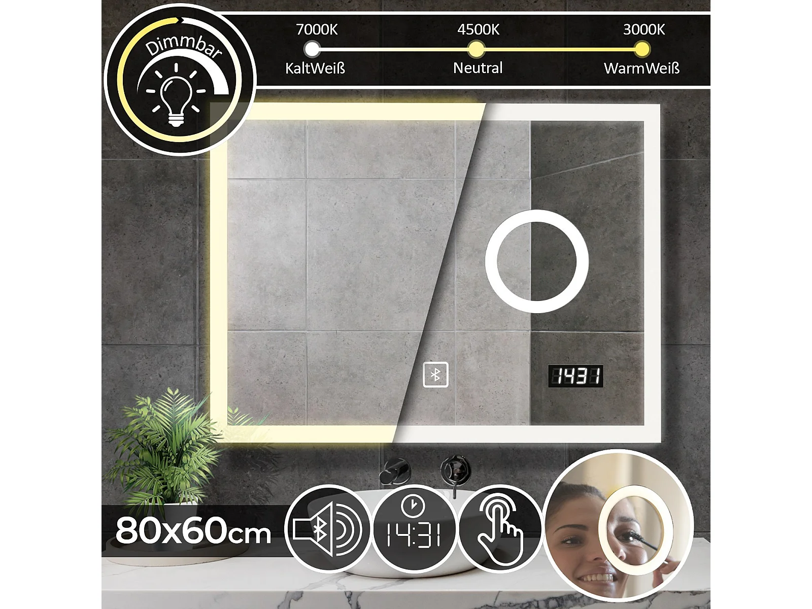 Miroir LED - 80x60 cm - avec haut-parleur Bluetooth + miroir de maquillage + horloge