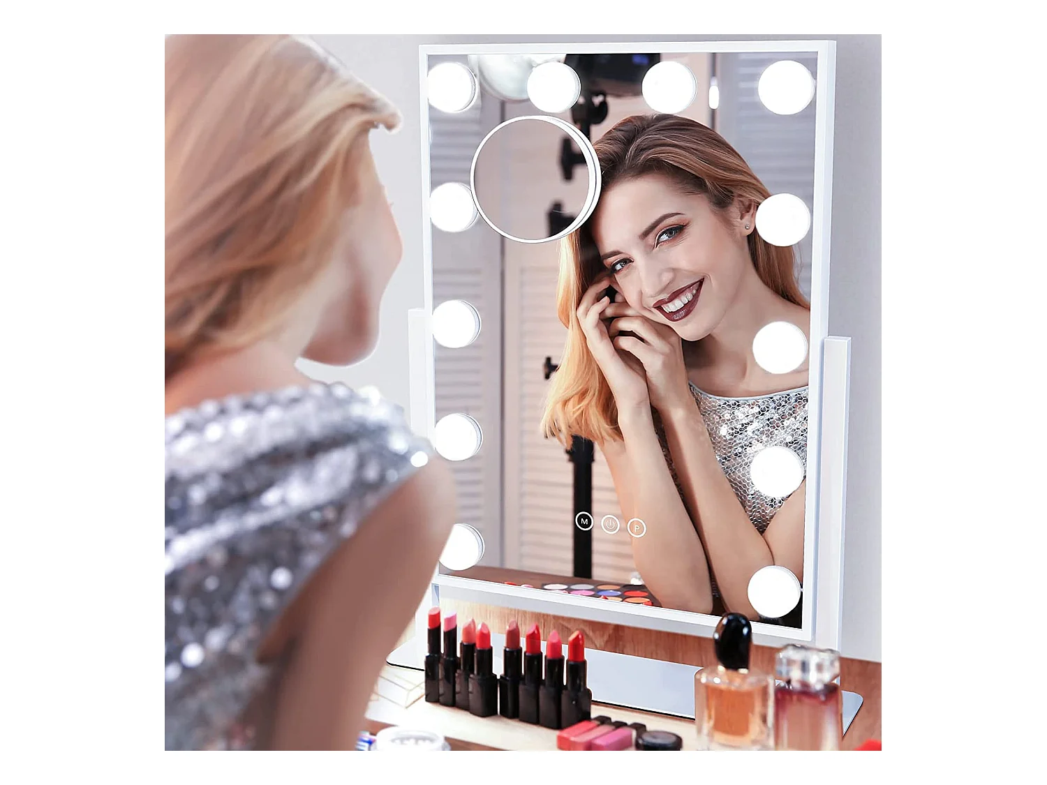 Miroir Maquillage Lumineux Hollywood 15 Ampoules,LED Miroir Coiffeuse Contrôle Tactile Luminosité Réglable sur Table et sur Mur 58x48cm - Blanc