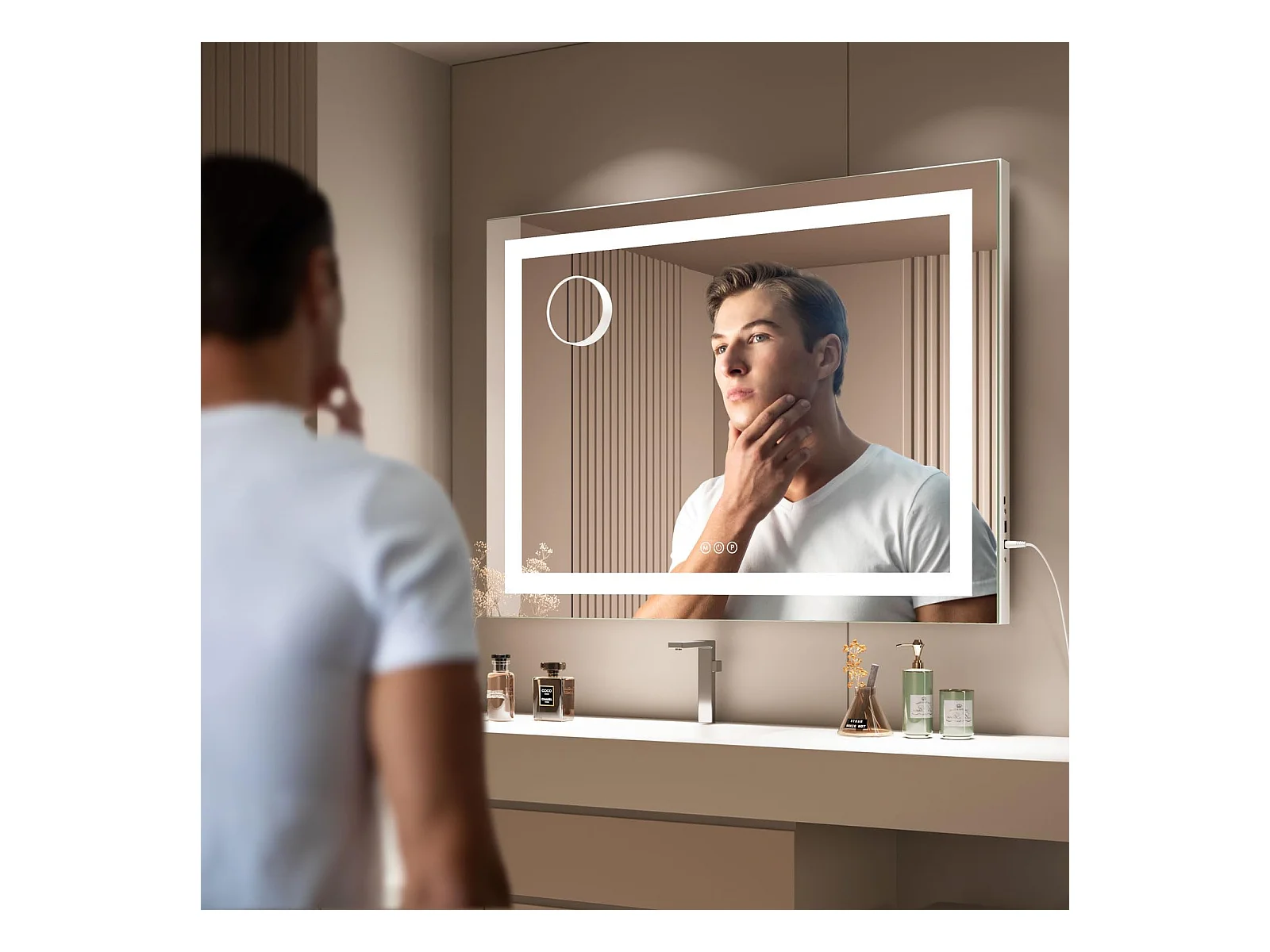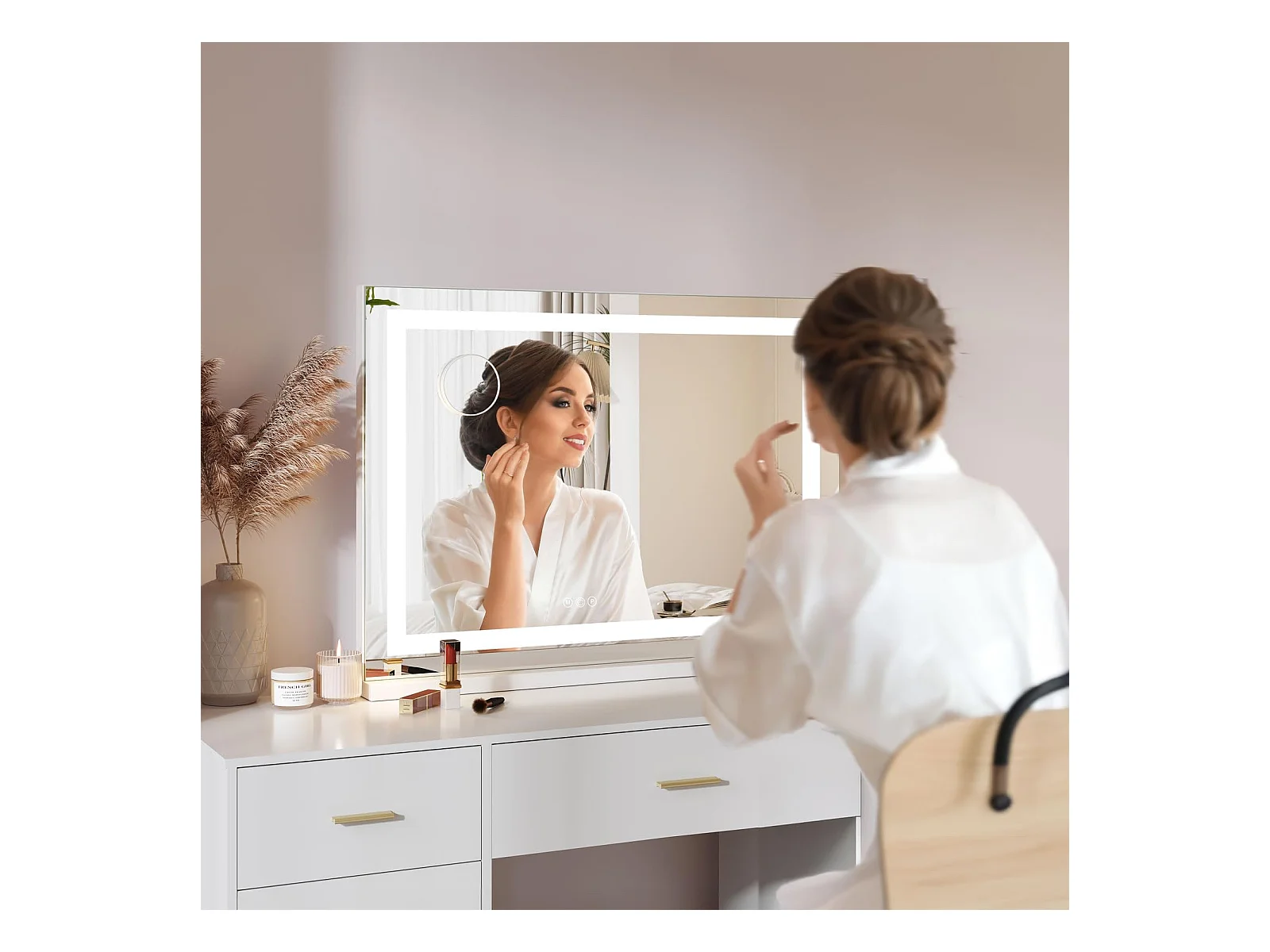 Miroir Maquillage LED 80x58cm, 3 Modes, Luminosité Réglable, Touch, USB/Type-C, Grossissante Incluse, Table ou Mur, Blanc