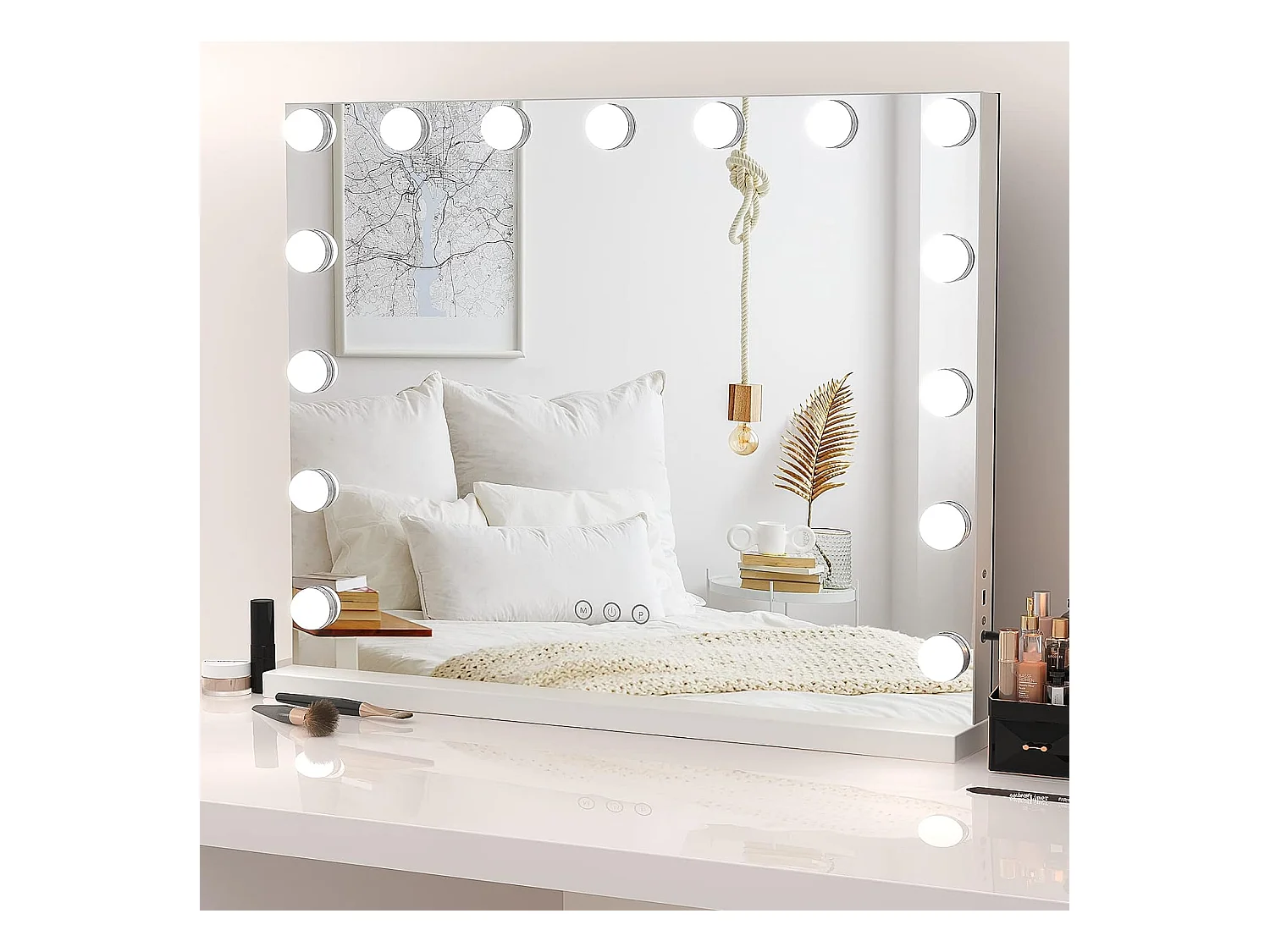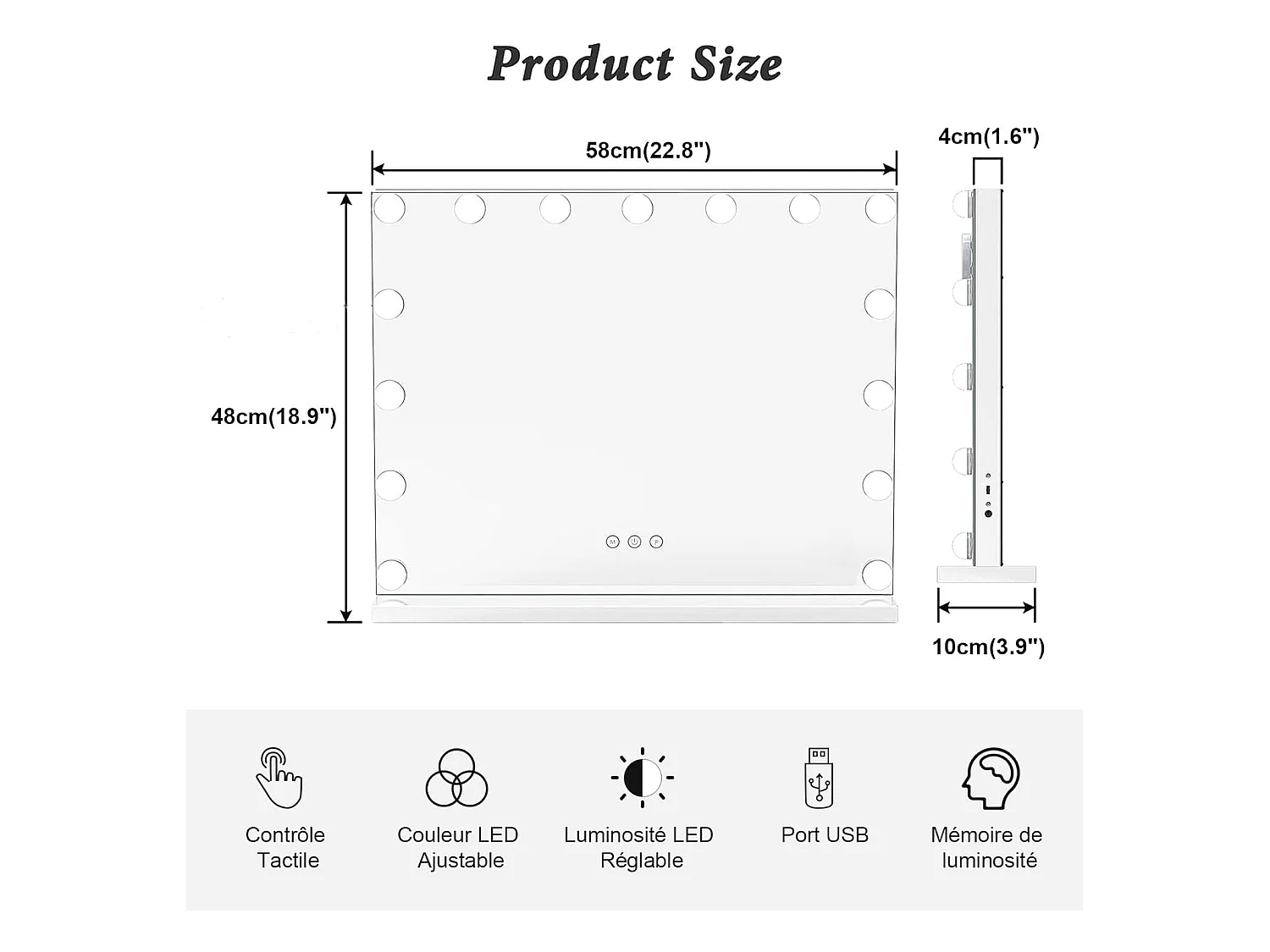 Miroir Maquillage Lumineux Hollywood 15 Ampoules,LED Miroir Coiffeuse Contrôle Tactile Luminosité Réglable sur Table et sur Mur 58x48cm - Blanc