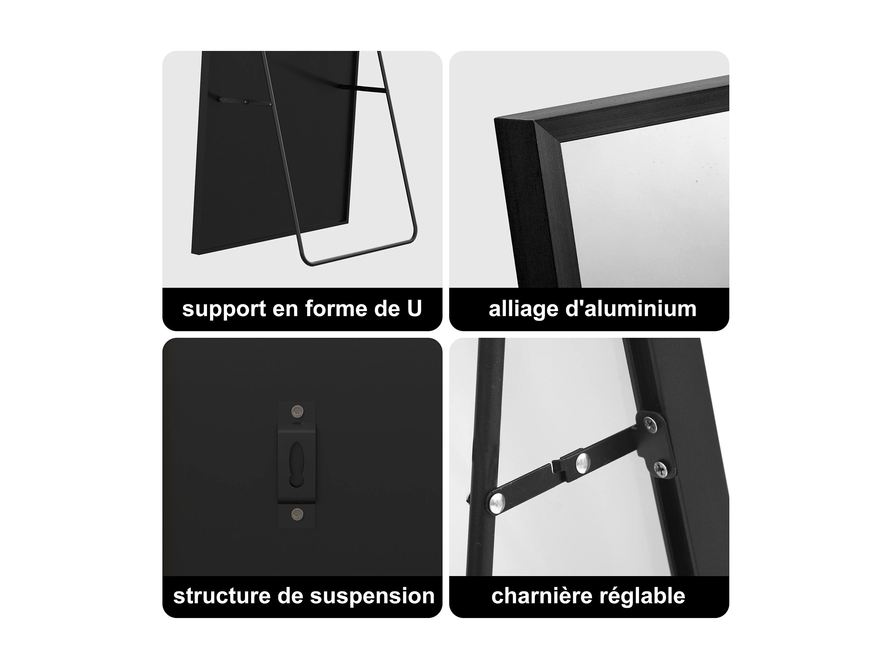 Miroir pleine longueur incassable 77 x 177 cm, sur pied ou mural, grand miroir de sol Noir