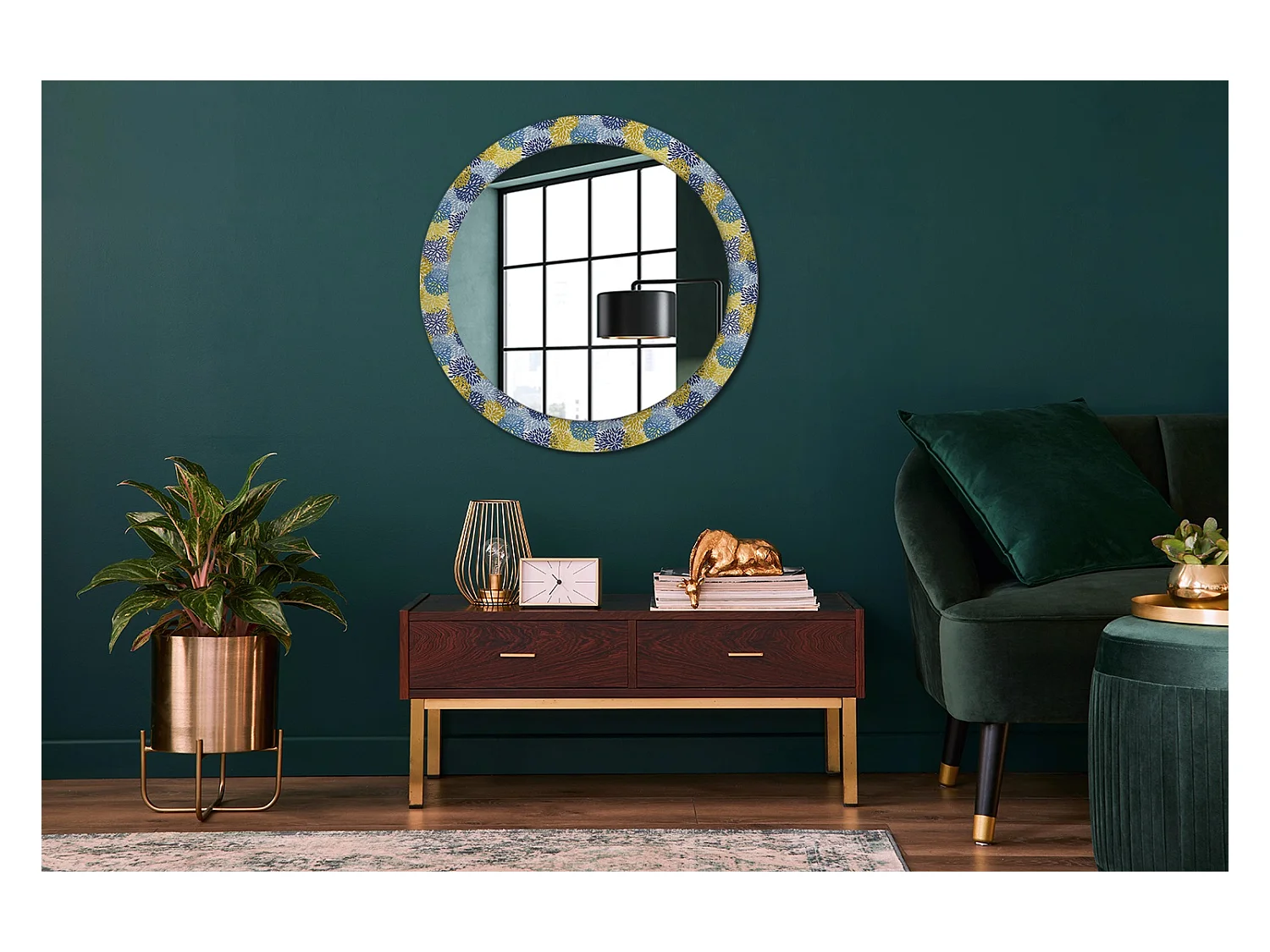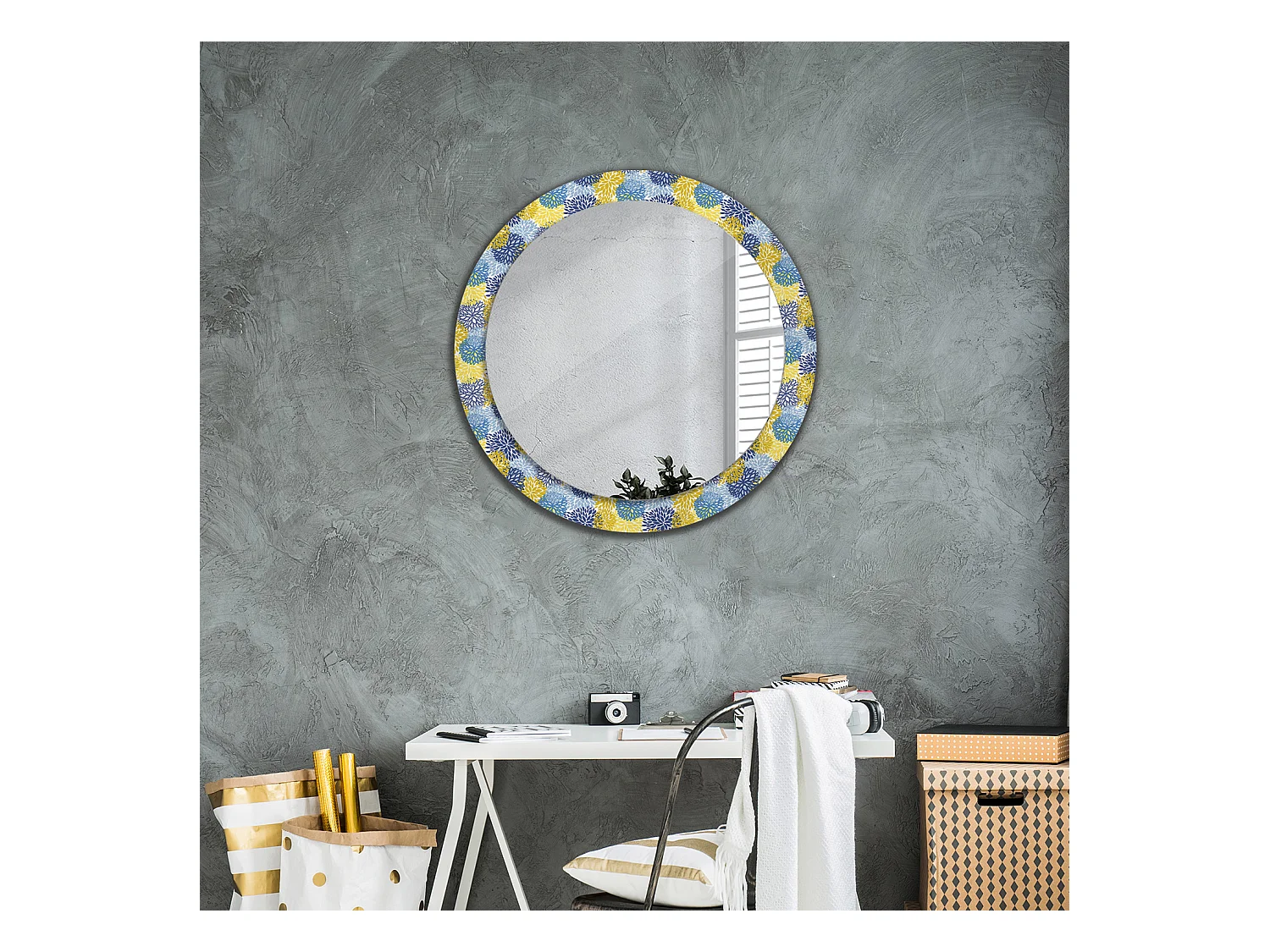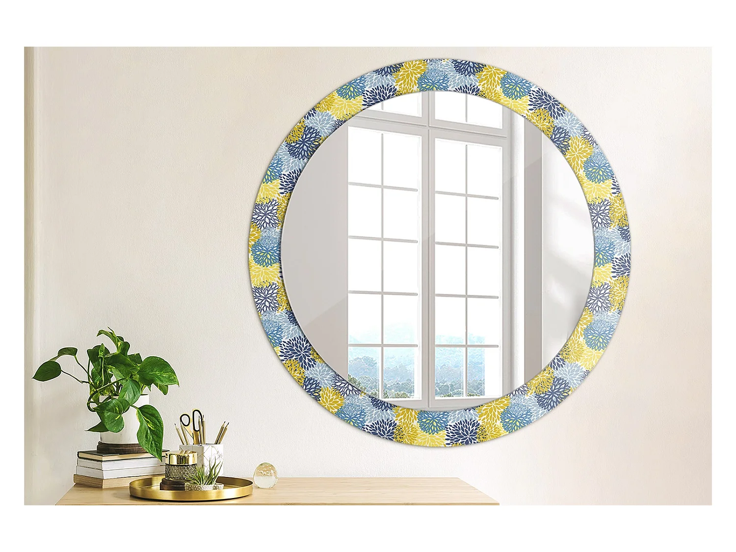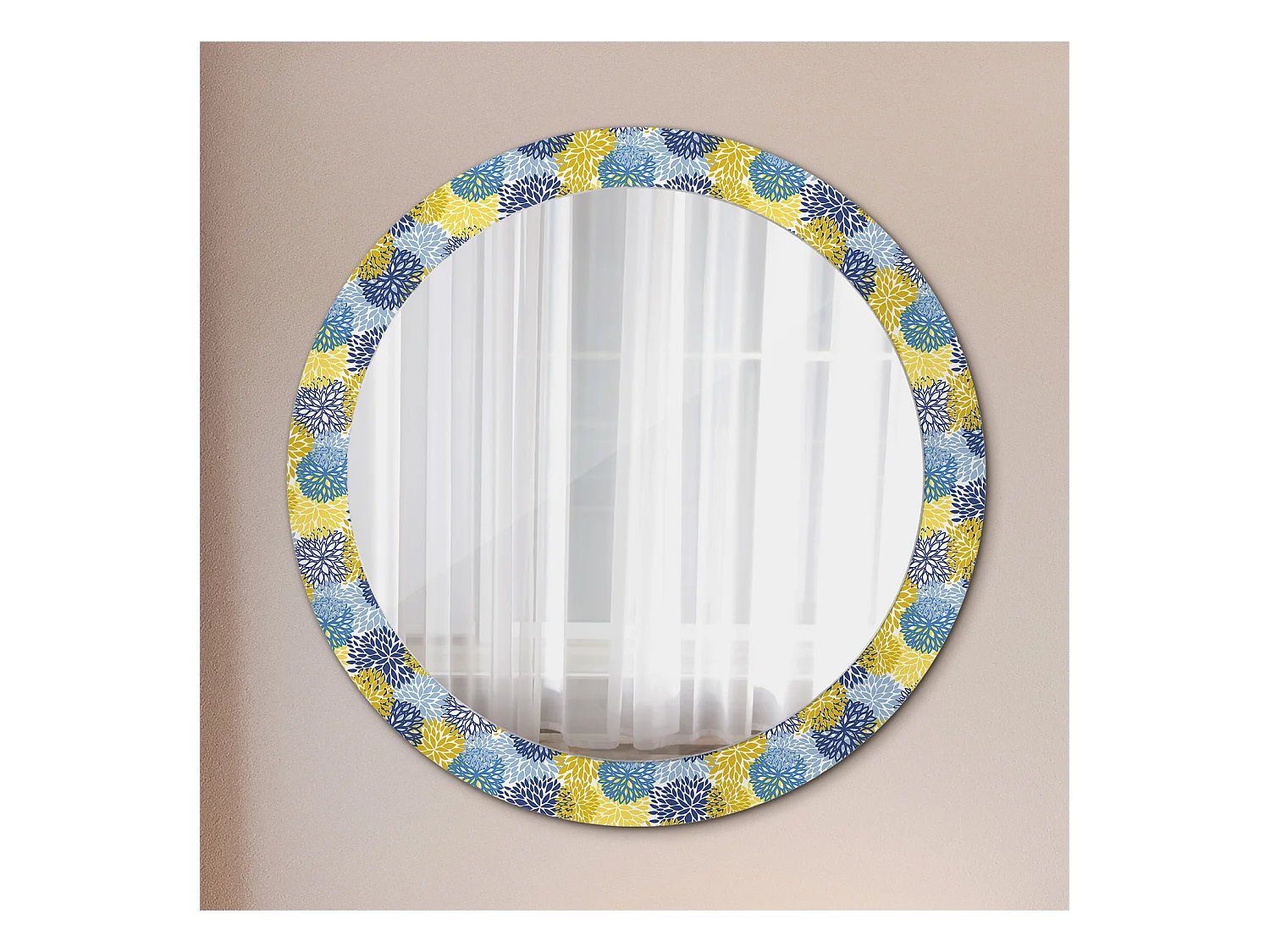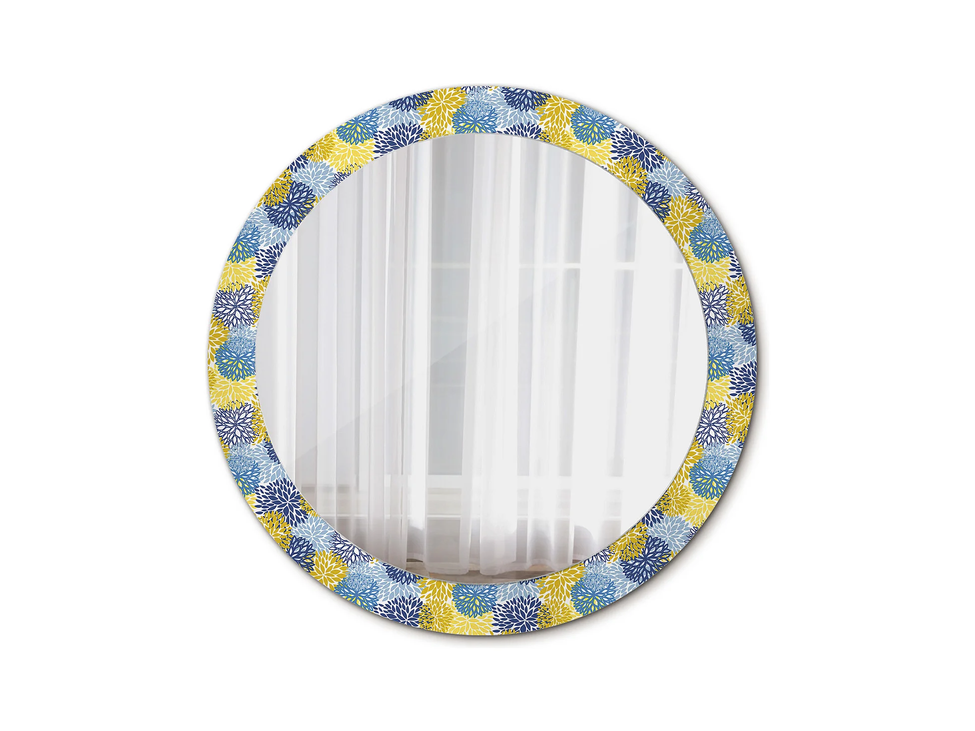Miroir rond décoratif - Fleurs bleues - 80 cm