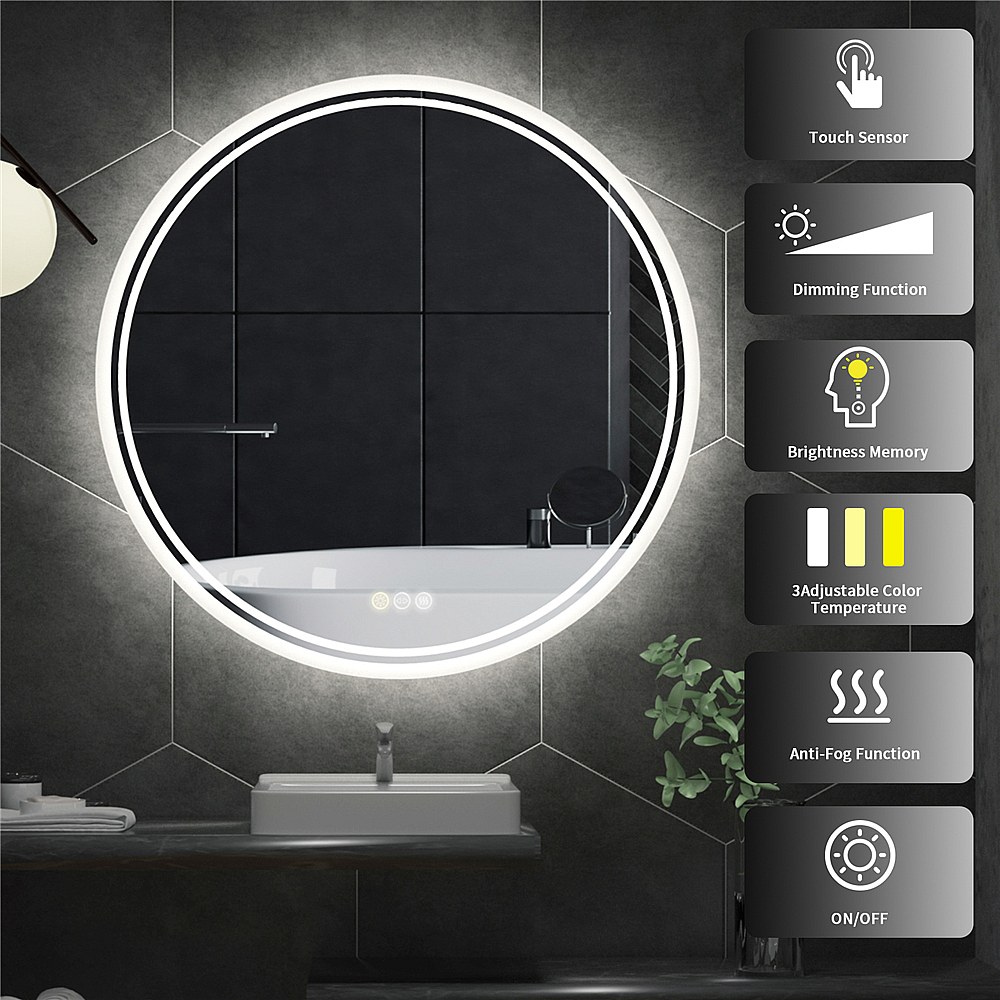 Miroir de salle de bain led rond 90x90cm miroir mural lumineux tricolore anti-buée 90x90cm