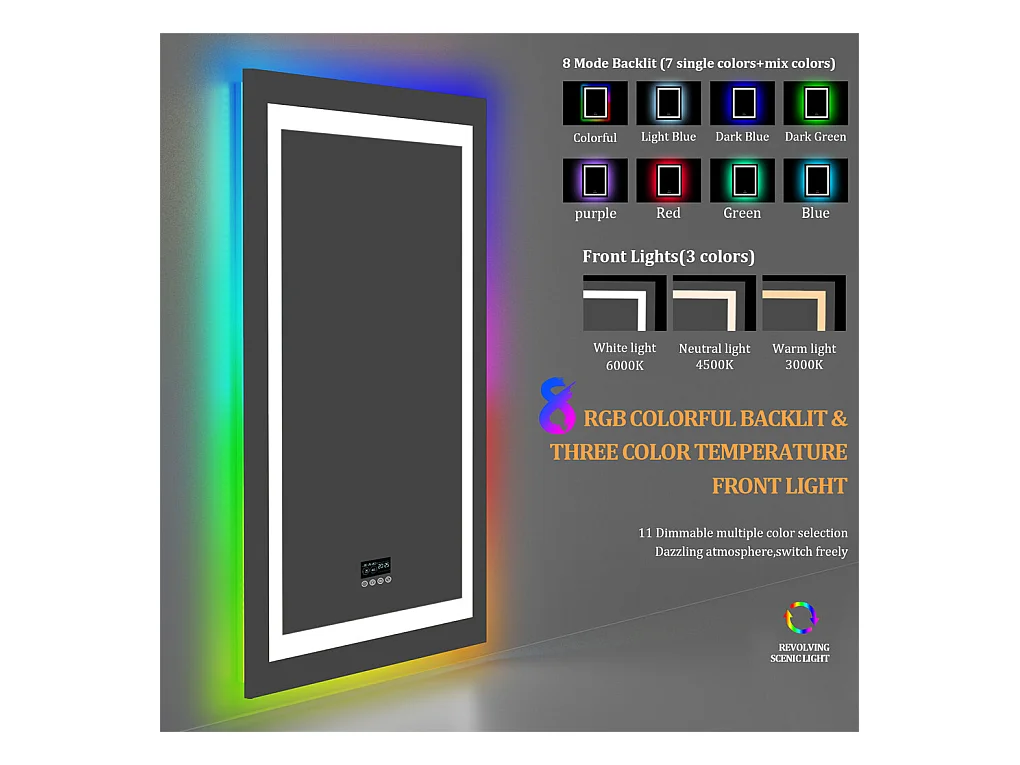 Miroir salle de bain 90x70cm RGB et LED réglable+antibuée+Bluetooth 5.2 +Horloge+3 couleurs 4 boutons