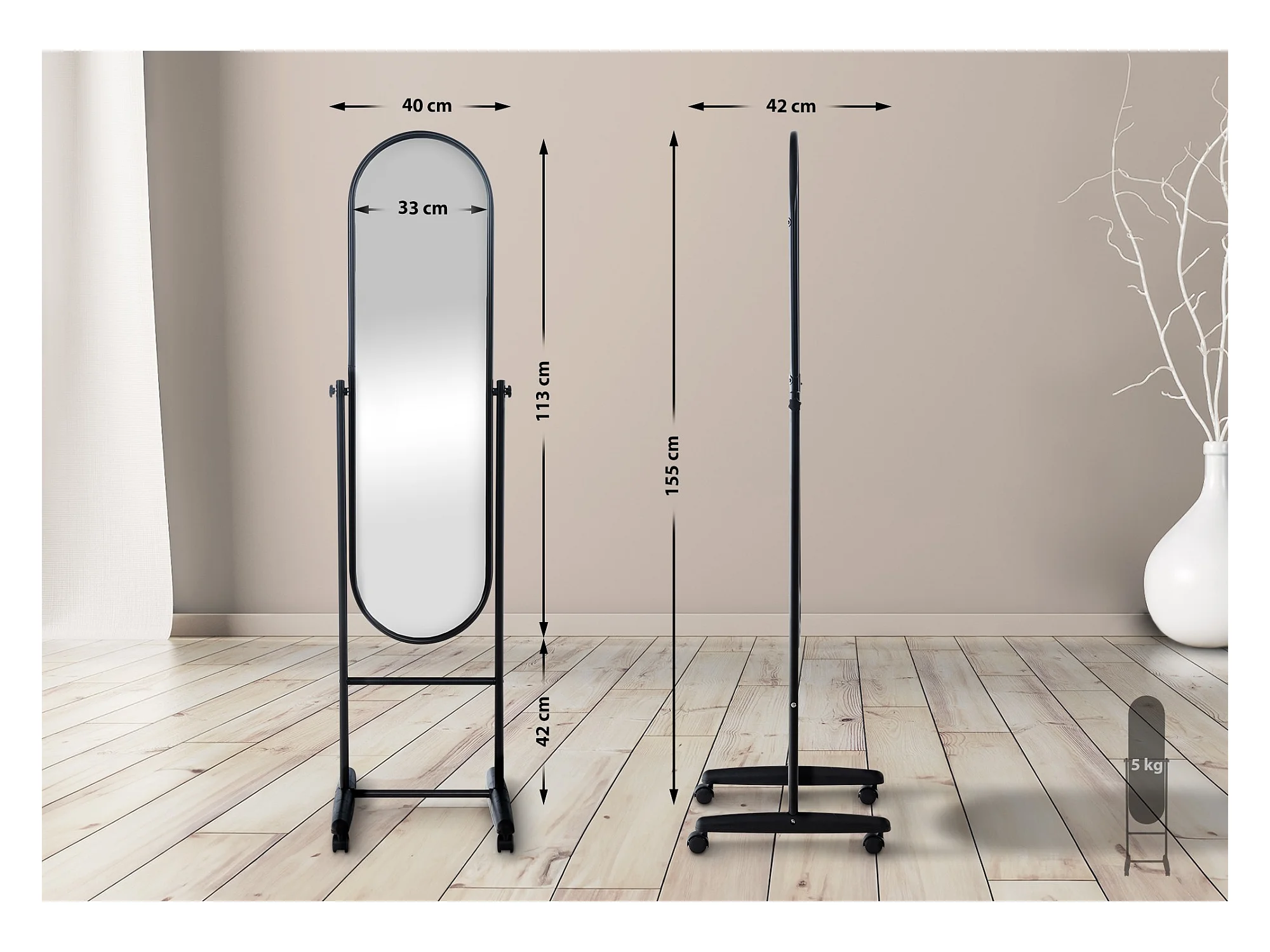 Miroir corporel ovale avec cadre en métal, miroir sur pied avec support, 160 x 40 cm, pour salon et chambre, Noir