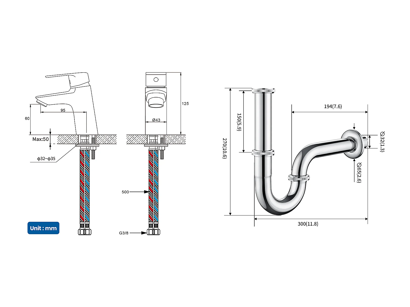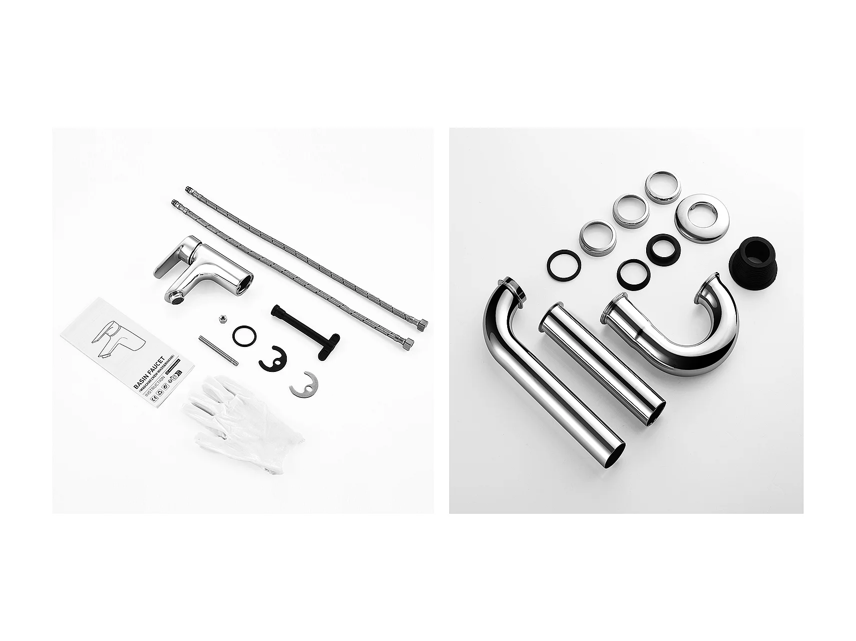 Mitigeur Lavabo Monotrou Chromé avec Trou de Tirette de Vidage,EAU Froide/Chaude+Siphon Lavabo Forme U Tube Siphon Anti-odeurs,Siphon Ø32 mm
